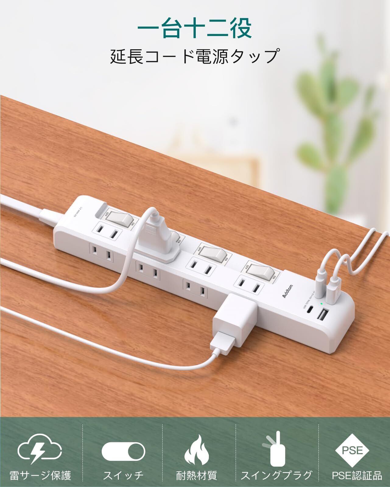 「Addtam 延長コード」は、充実した機能で家庭やオフィスの様々なニーズに応える電源タップです!8個のAC口と2つのUSB-Aポート、さらに2つのType-Cポートを搭載しているため、デバイスを同時に多く接続・充電することが可能です。シックなブラックデザインは、どんなインテリアにも調和します。