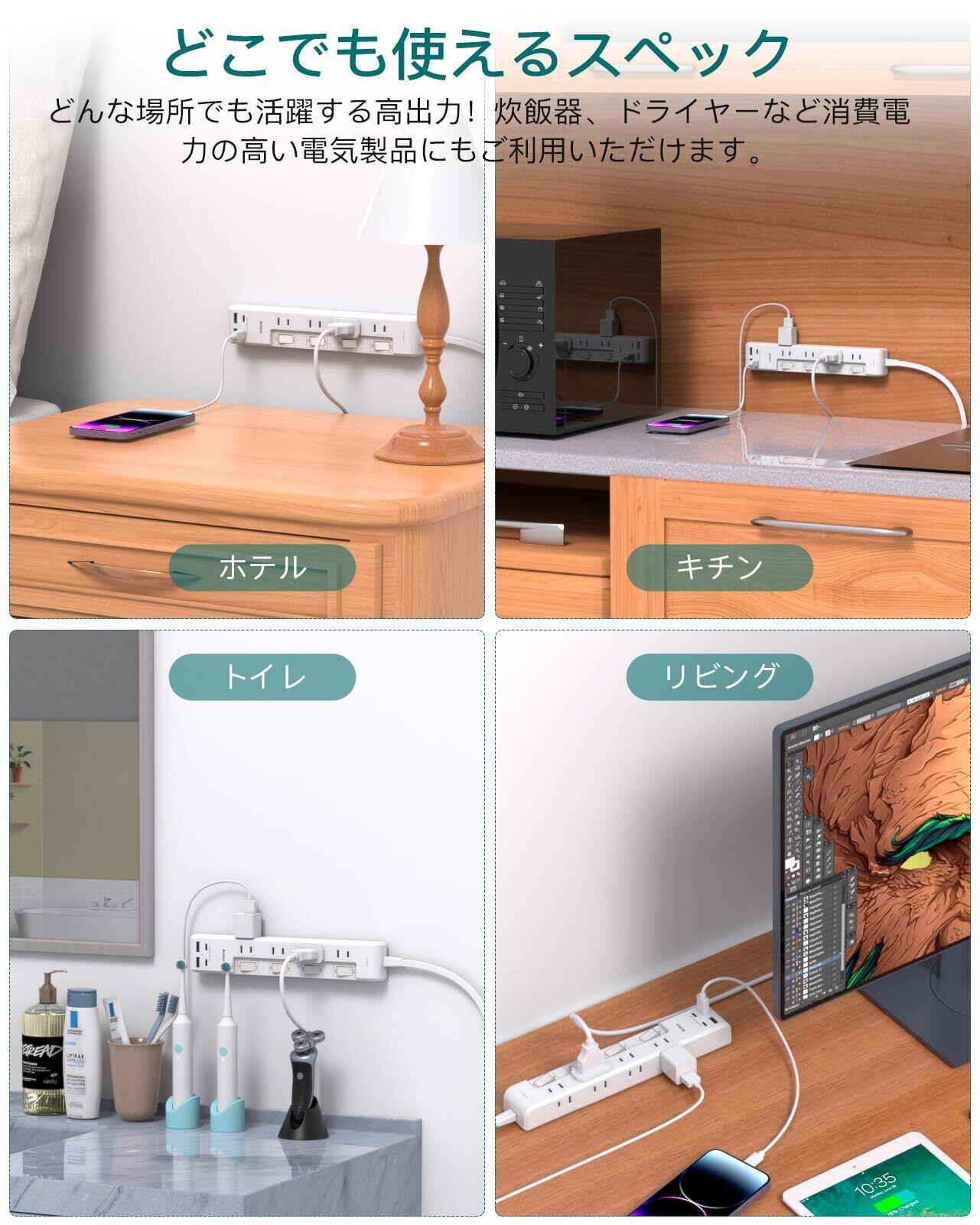 【壁掛け用·卓上に&2mケーブル】コンセントタップは壁等に仮固定できるフック穴付き、壁にかけてご利用できます。省スペースで、配線もスッキリになります。テーブルタップの底の四角にゴム製の滑り止めがついており、卓上で安定感があります。両立な使い方あり、お客様に心地よい生活を与えます。使い勝手のいい2mケーブルを採用し、コンセントから少し離れた場所でも利用できます。家庭、オフィス、会議室、パーティーなどにも大活用できます。