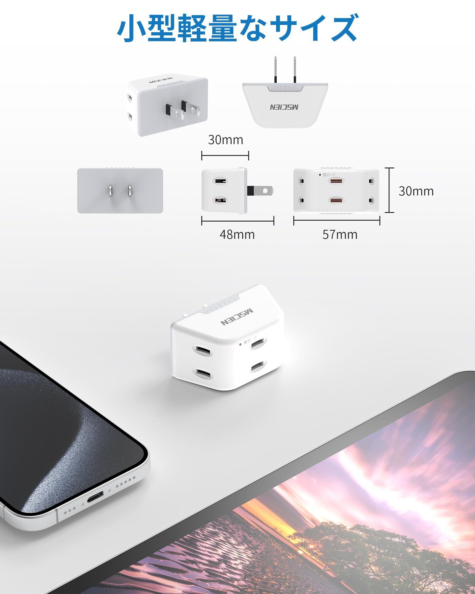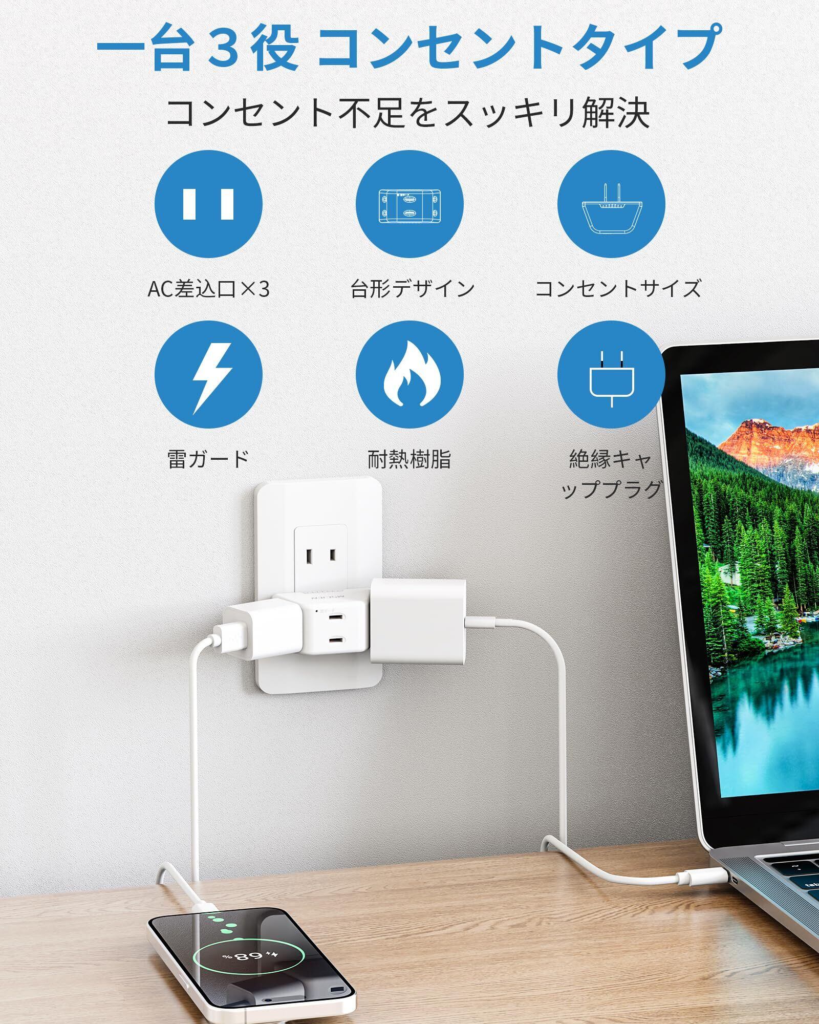 3口のコンセントがあることで、複数のデバイスを同時に接続・充電可能です。サイズもコンパクトで、持ち運びに便利だから、出張や旅行にも最適です。また、設置場所を選ばず、デスクやテーブルの上でもおしゃれに使用できます。