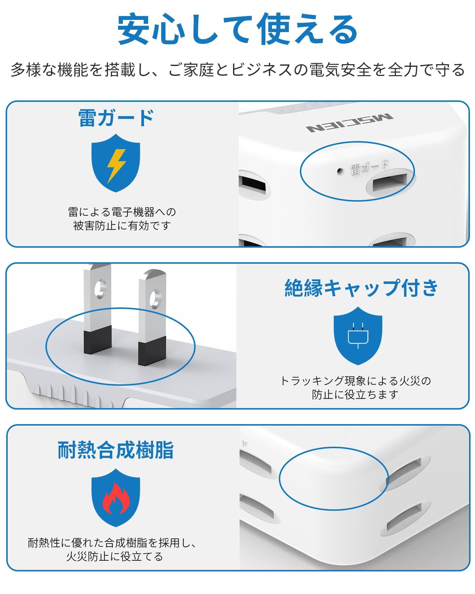 【雷ガード・優れた安全性】マルチタップは雷ガード機能が搭載しており、雷サージによる電子機器への被害防止に有効です。雷ガードランプが正常に動作している時に点灯しています。また、耐熱性に優れた合成樹脂を使用しており、プラグには絶縁キャップが付いており、感電・火災のリスクを軽減できます。電力利用を安心安全にサポート。