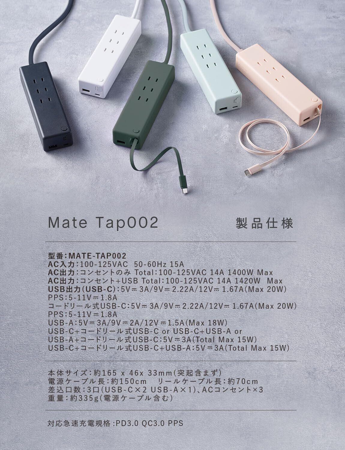 【使用可能な出力】電源タップ3口合計最大1400W(USB充電器併用時は1420W)。USBタイプC1ポート充電時最大20W、3ポート同時充電時の合計最大出力15W。(詳しい出力などの仕様は画像をご確認ください。)PD急速充電規格対応 PSE技術基準適合。