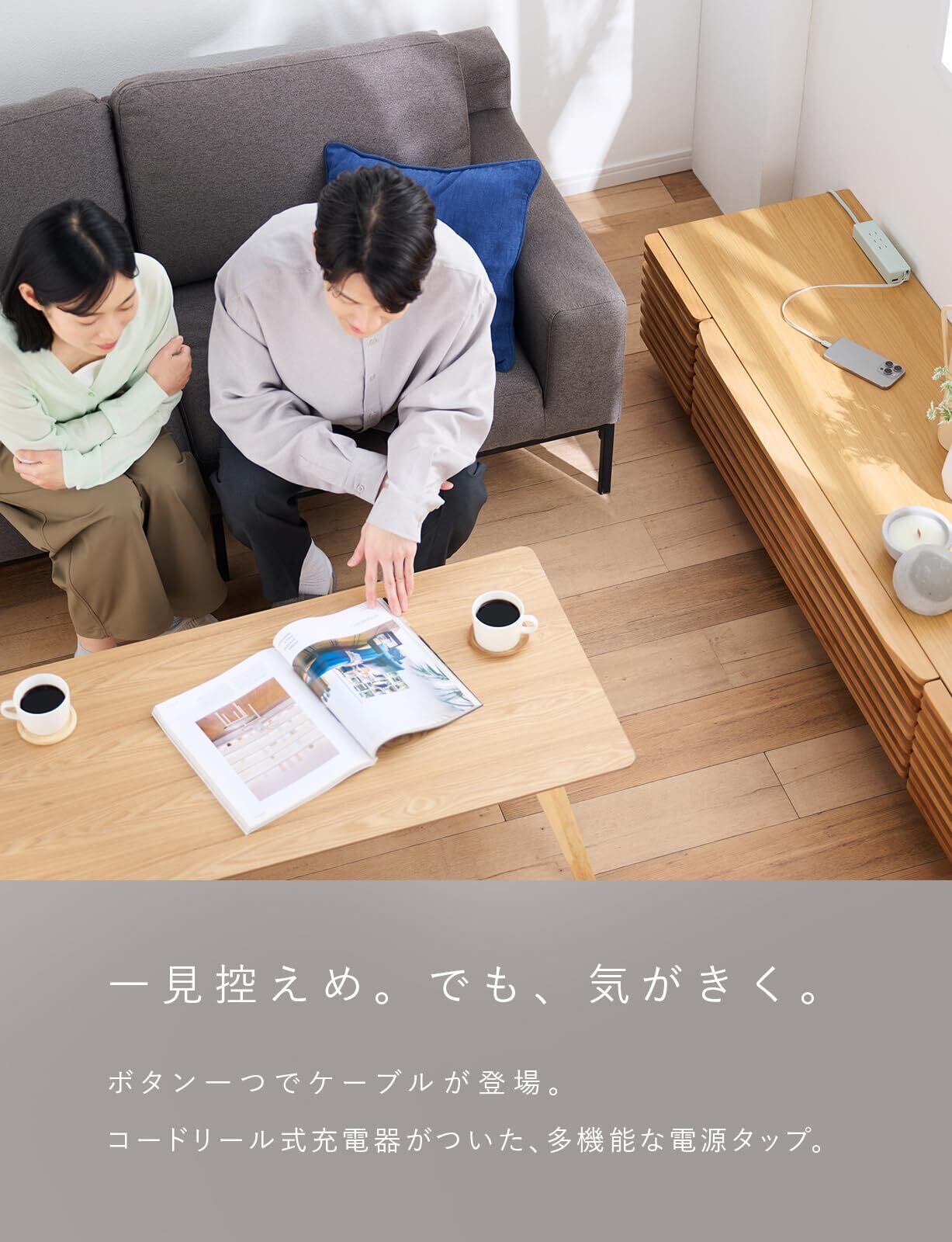 電源タップにUSB充電器とUSBケーブルを内蔵。充電する時はさっとケーブルを引き出し、使い終わったらさっと収納。充電器まわりがスッキリきれい。