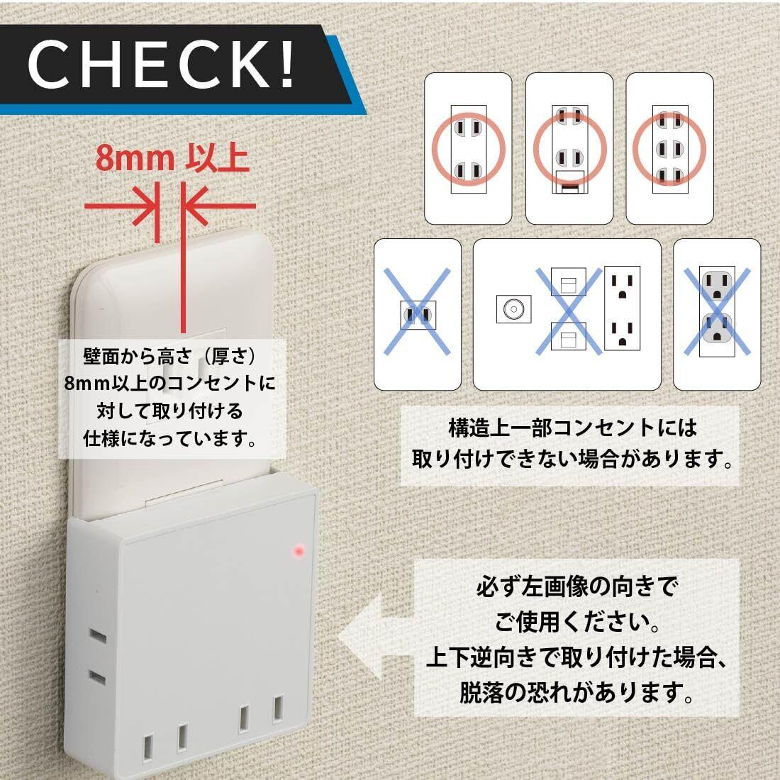 この電源タップは、4つのACコンセントを搭載しており、複数の機器を同時に接続可能です。広めの差込口間隔は、ACアダプタや大型プラグも楽に挿せる設計になっており、利便性が高いのが特徴です!