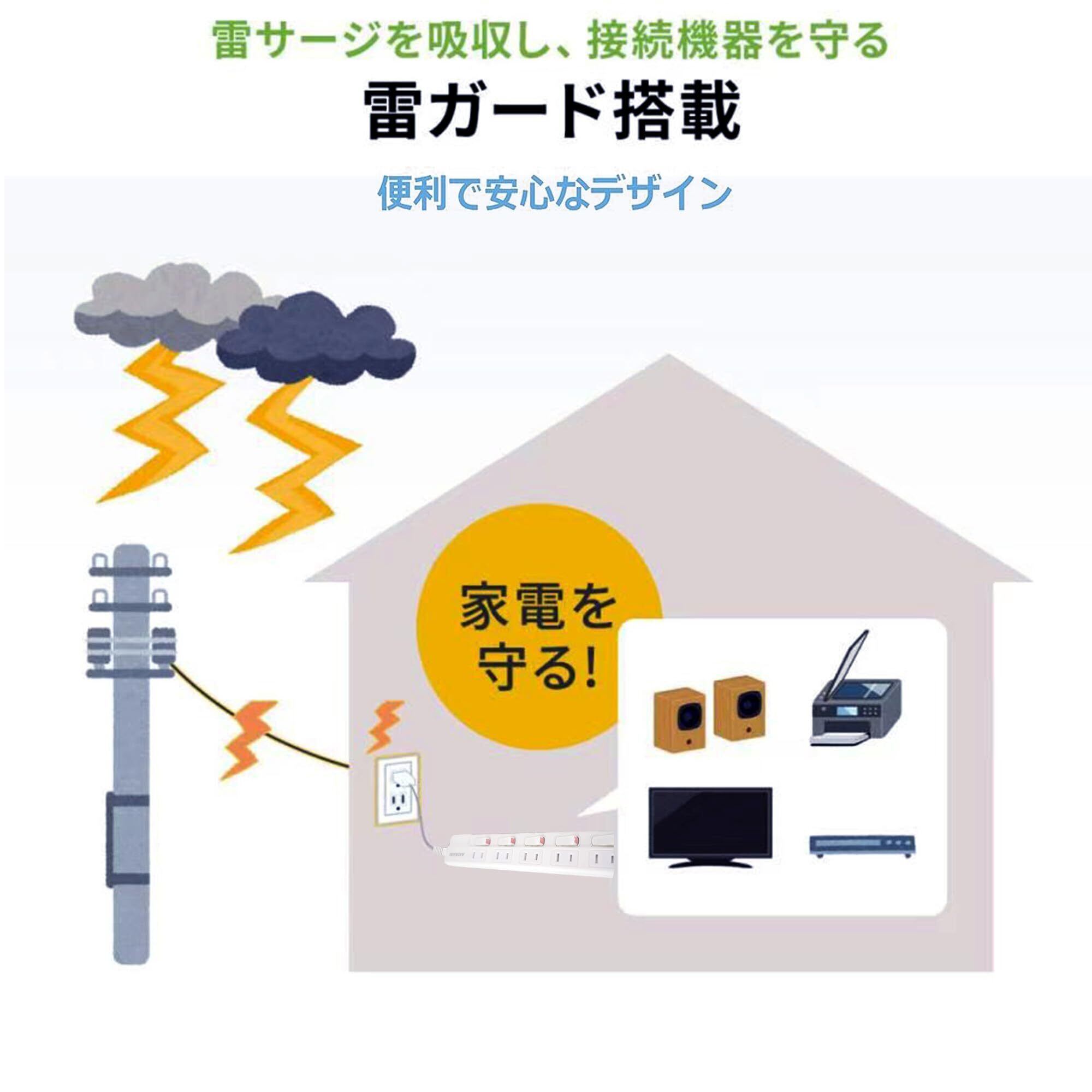 本製品の雷ガード機能により、落雷から接続機器を保護します。さらに、過電流や過熱を防ぐ機能が搭載されており、安心してご使用いただけます。トラッキング防止設計が施されているため、安心感も増します。