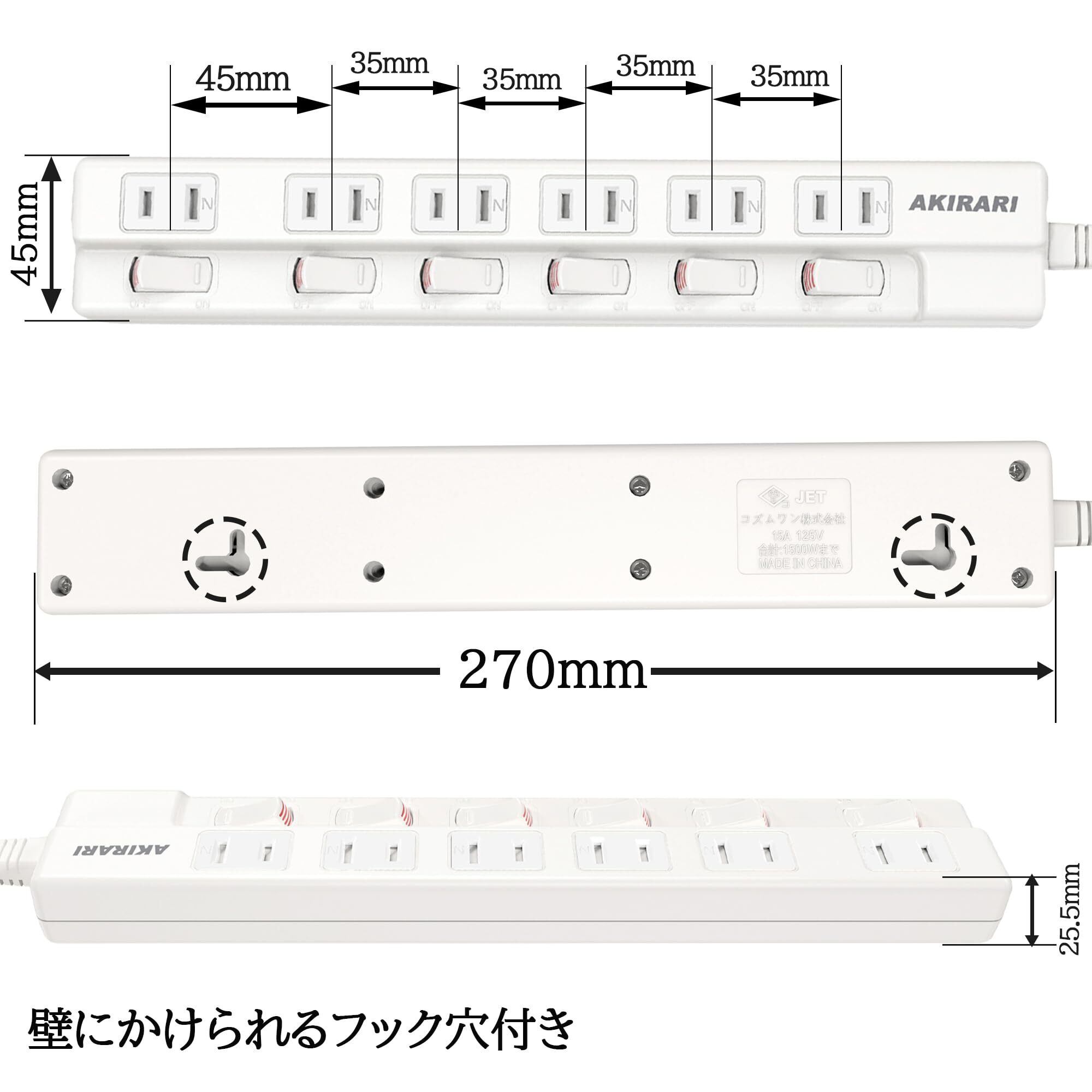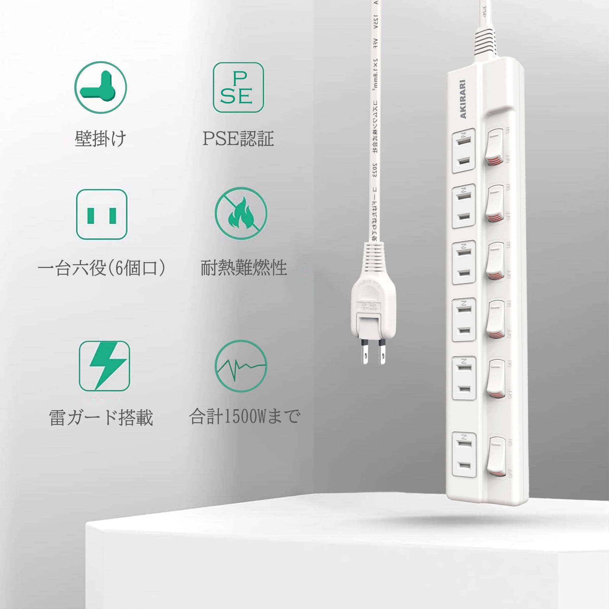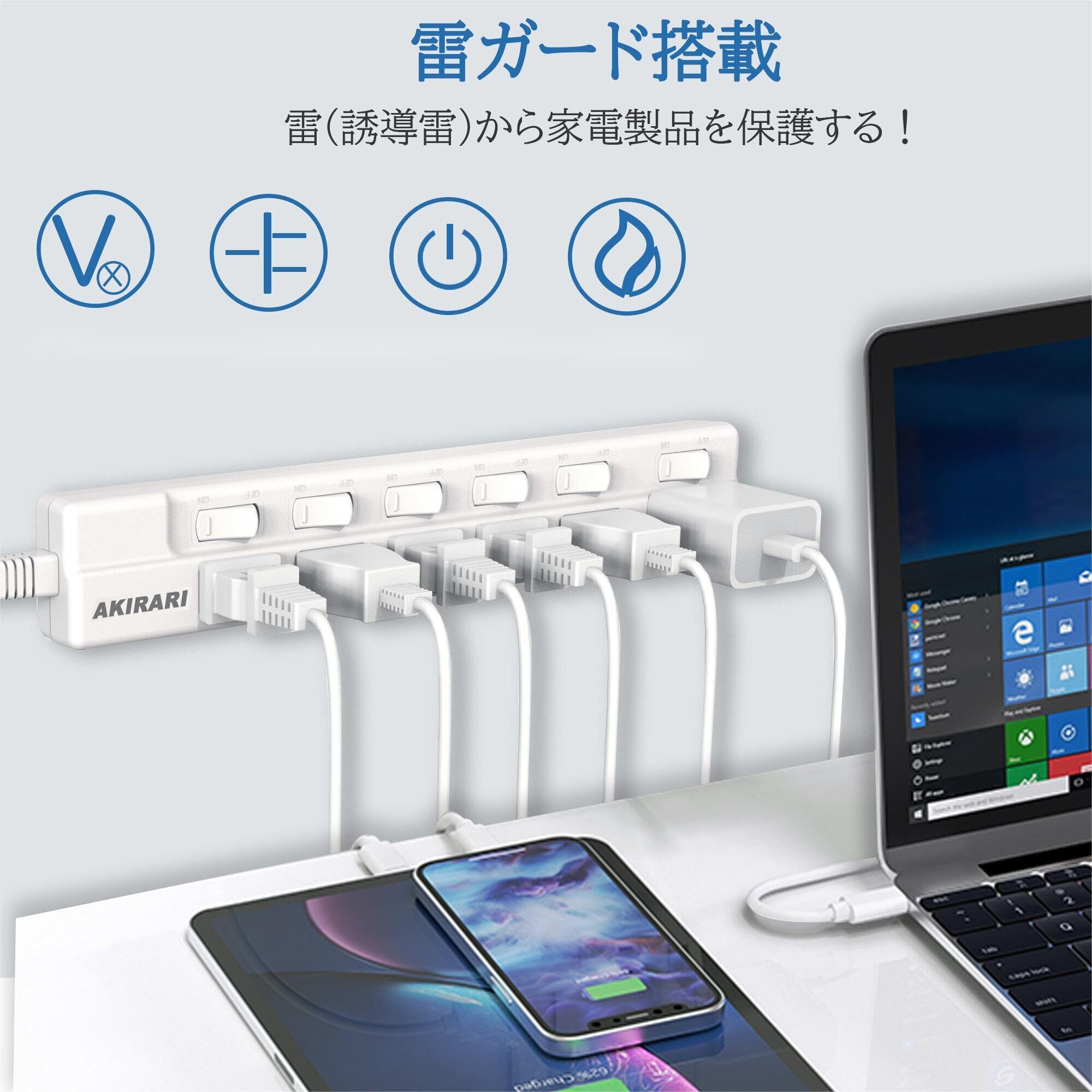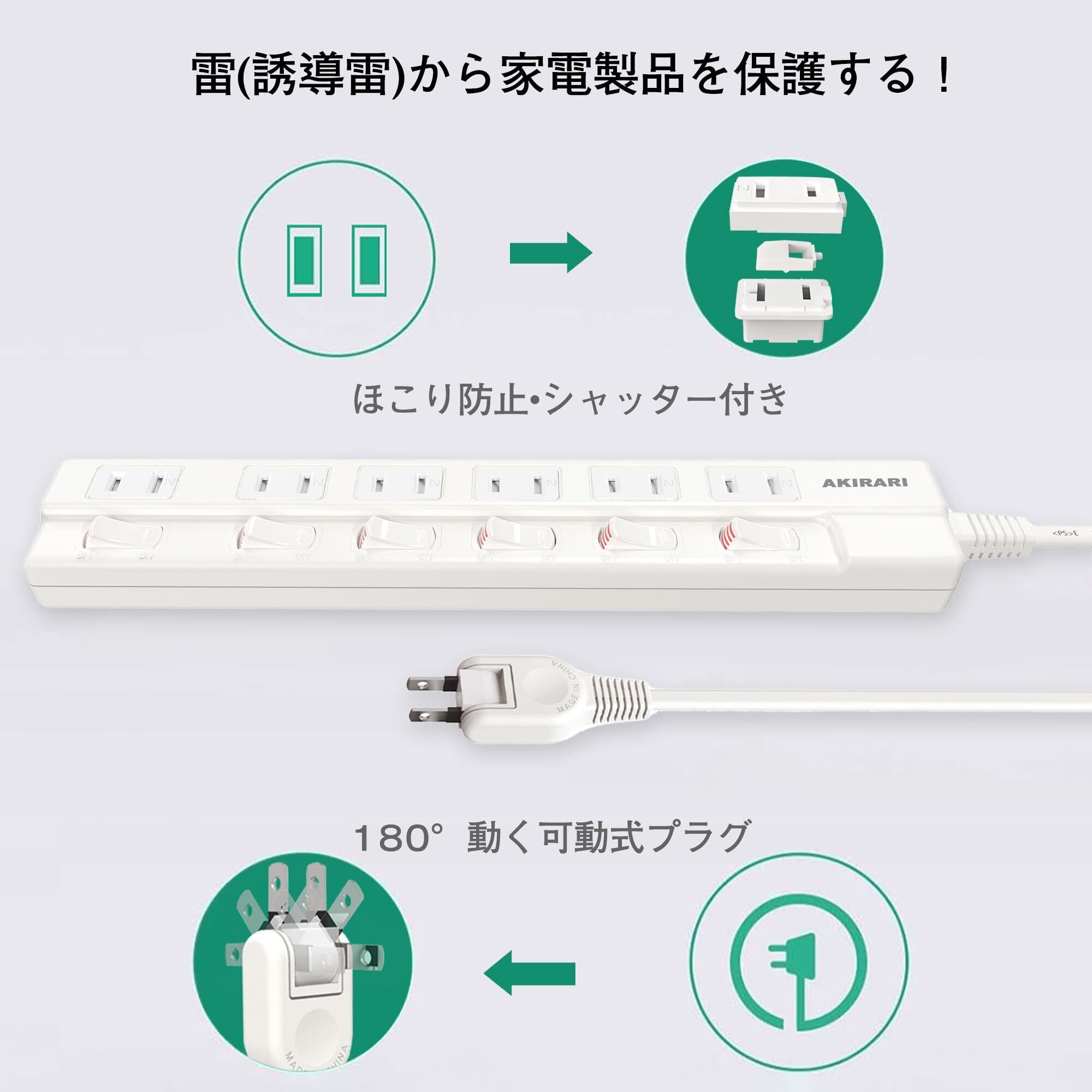 【防塵防雷 個別スイッチ】 電源タップ 6口 AKIRARI コンセントタップ ホワイト 雷ガード スイッチ電源タップ テーブルタップ 延長ケーブル 1m 家庭用 6個口 ほこりシャッター付 過電流 過熱保護 すき間 180度スイングプラグ トラッキング防止 節電 省エネ 延長コード おしゃれ 電源 壁 卓上 薄型 コンパクト (1M)