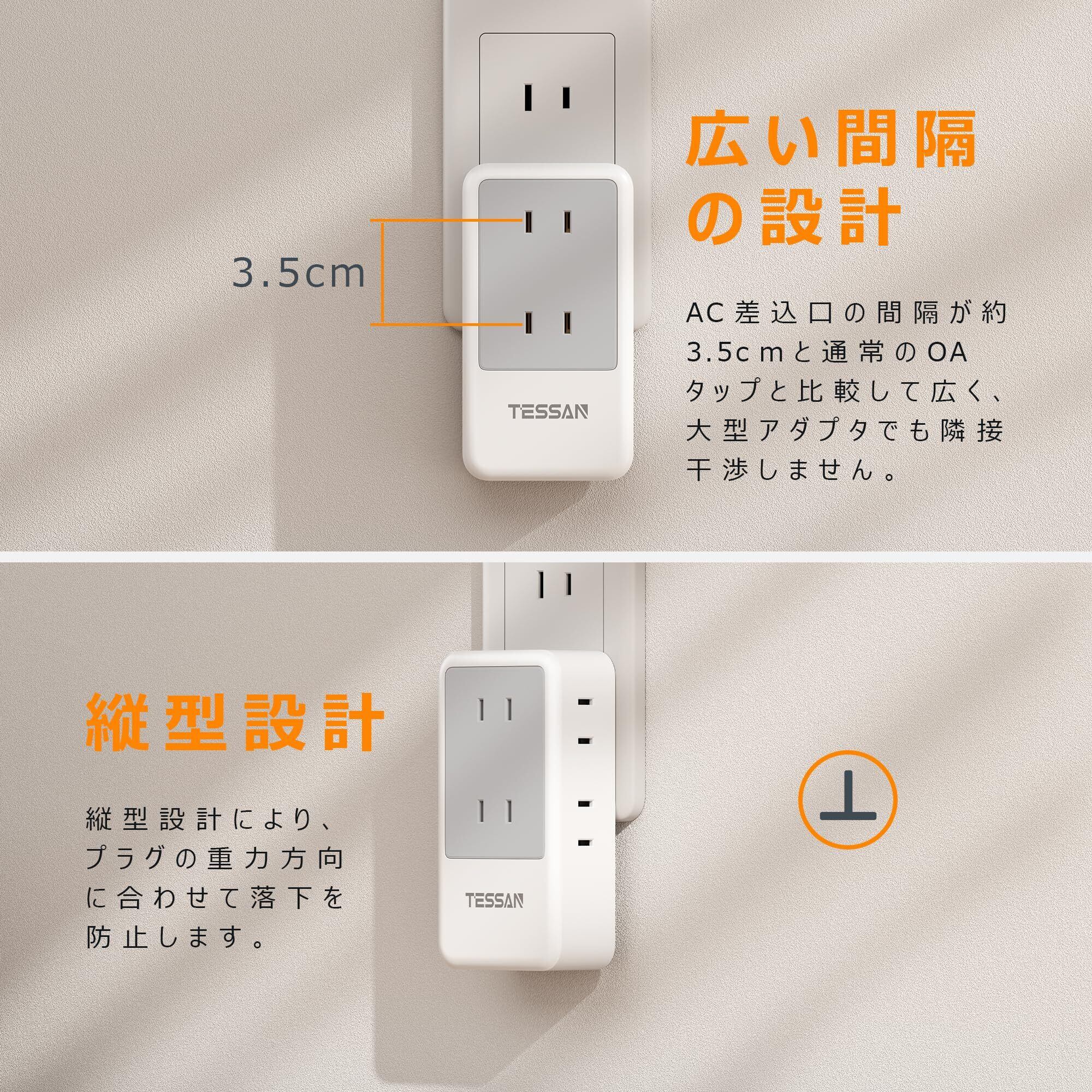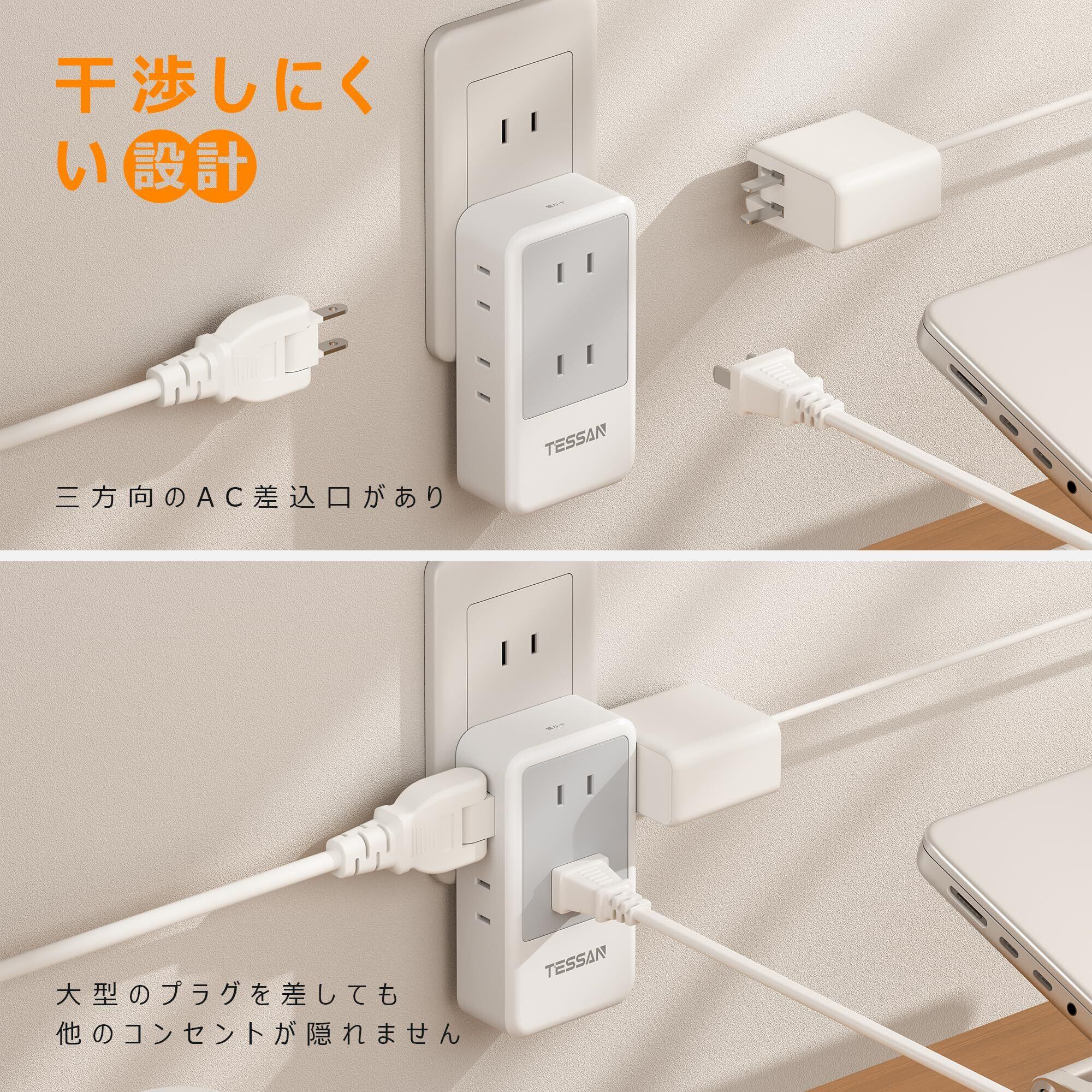 【互いに干渉しない蛸足コンセント】TESSANのコンセントタップは違った方向に分岐していて、AC差込口が前面と両側面にあるため、充電するときにお互いのACアダプタが干渉せずに使えます。