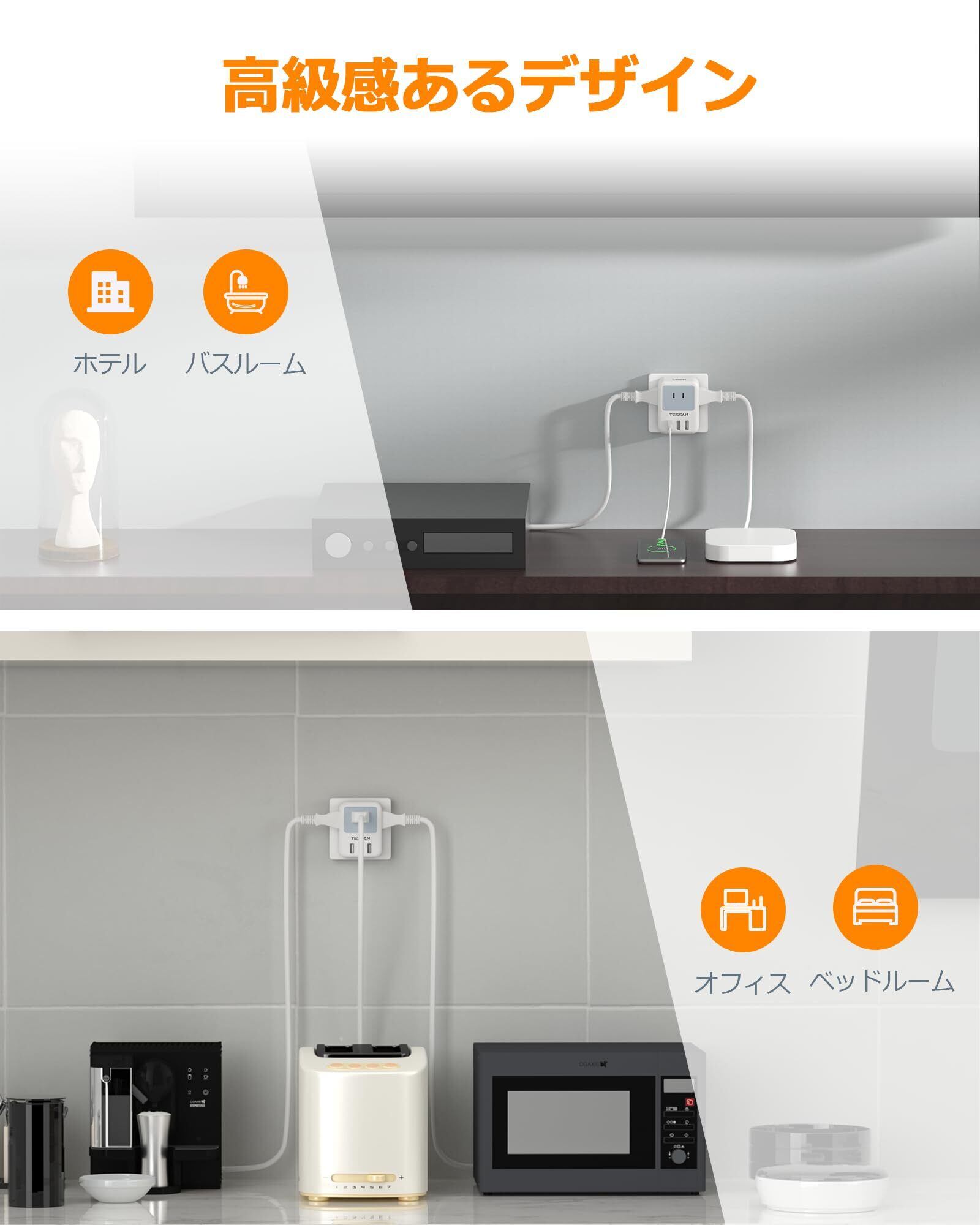 「様々な安全面に配慮したコーナータップ」:*電気火災を防止するため、タップ本体は耐熱性にすぐれたABS樹脂を使用。プラグには絶縁キャップが付いており、トラッキング火災の予防に役立ちます。それに、薄いのデザインのため、壁のコンセントにぴったりとフィットし、安定性高い壁挿しタップ!