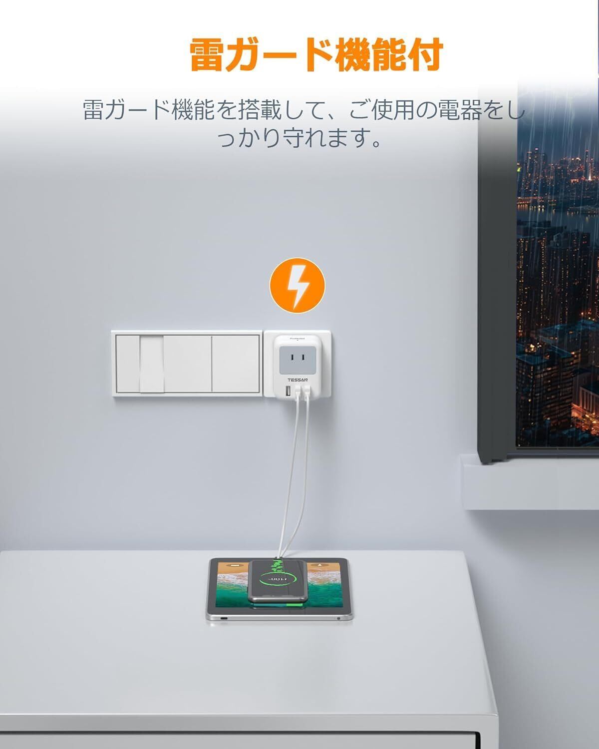 「USB コンセント タップ TESSAN」は、雷ガード機能を備えた安心の電源タップです!3つのACコンセントと3つのUSB-Aポートを搭載しており、同時に複数のデバイスを接続し、快適な充電環境を提供します。