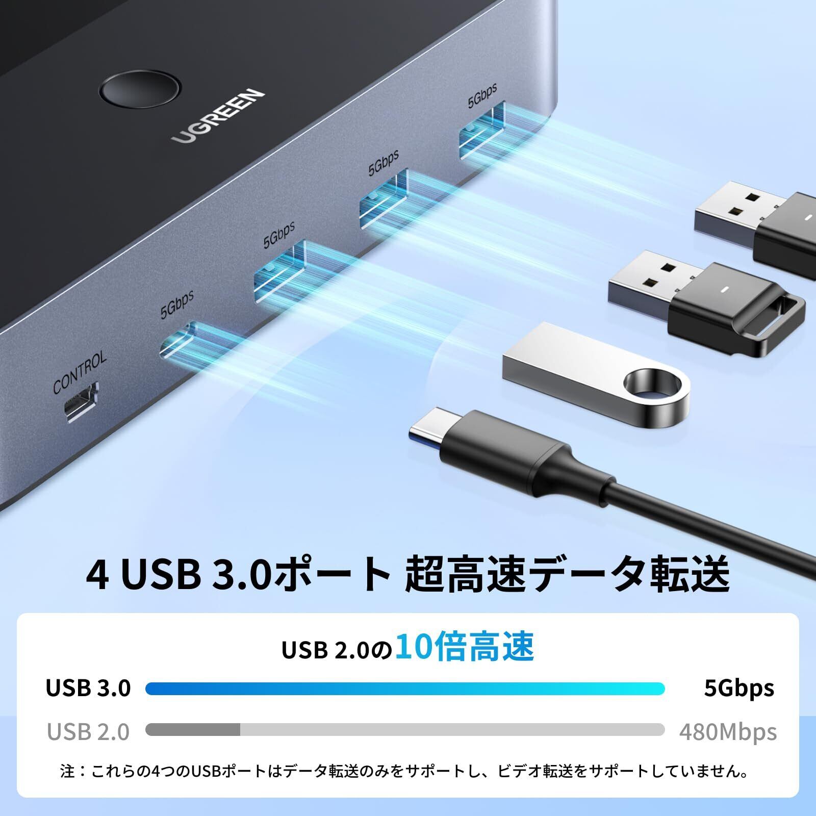 【4 USB 3.0ポート付き】: このHDMI KVMスイッチは、マウス、キーボード、USBフラッシュドライブ、プリンタ、モバイルハードドライブ、その他のUSBデバイスを共有するための4つのUSB 3.0ポート(3 USB-A+1 USB-C)を備えています。USB 3.0は最大5Gbpsのデータ転送速度を提供し、より高速なデータ転送で作業を効率化します。