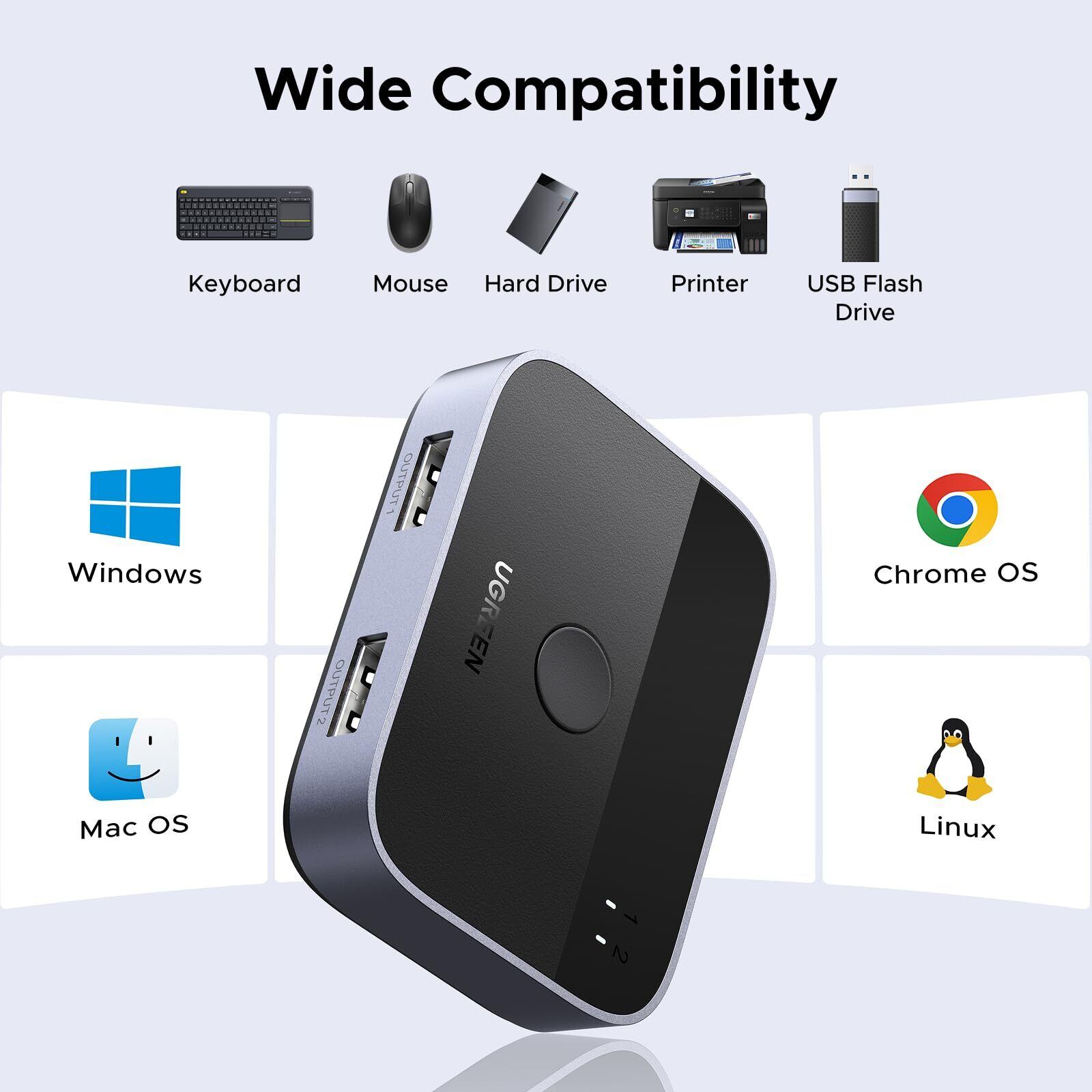 【幅広い互換性とドライバ不要】: UGREEN USB切り替え機は、Windows、macOS、Chrome OS、Linuxコンピュータ用のプラグ&プレイです。プラグインするだけで、効率的な作業を楽しむことができます。