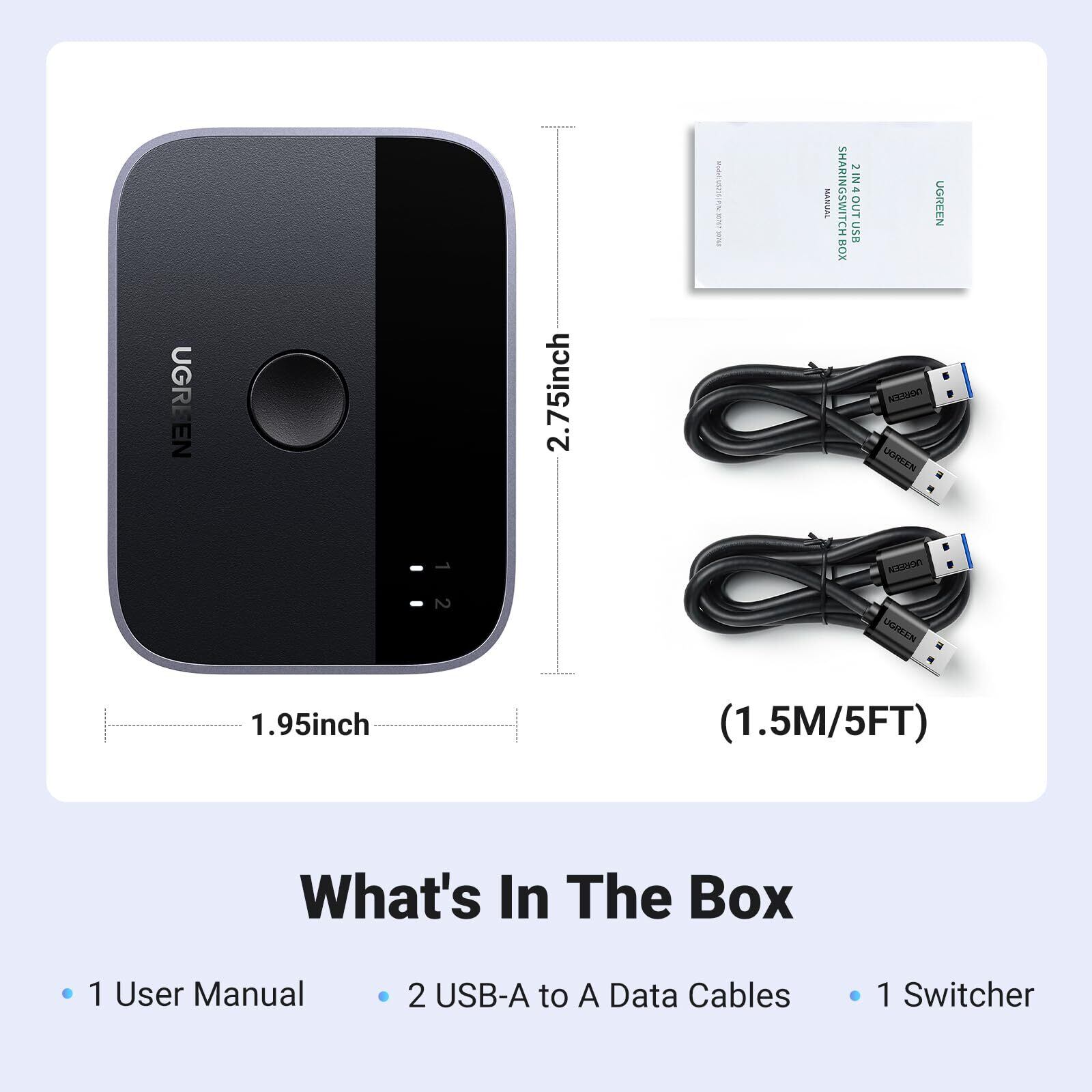 UGREEN USB3.0切替器、USBケーブル2本が付属しています。すぐに使用を開始できるので、セットアップが簡単です。