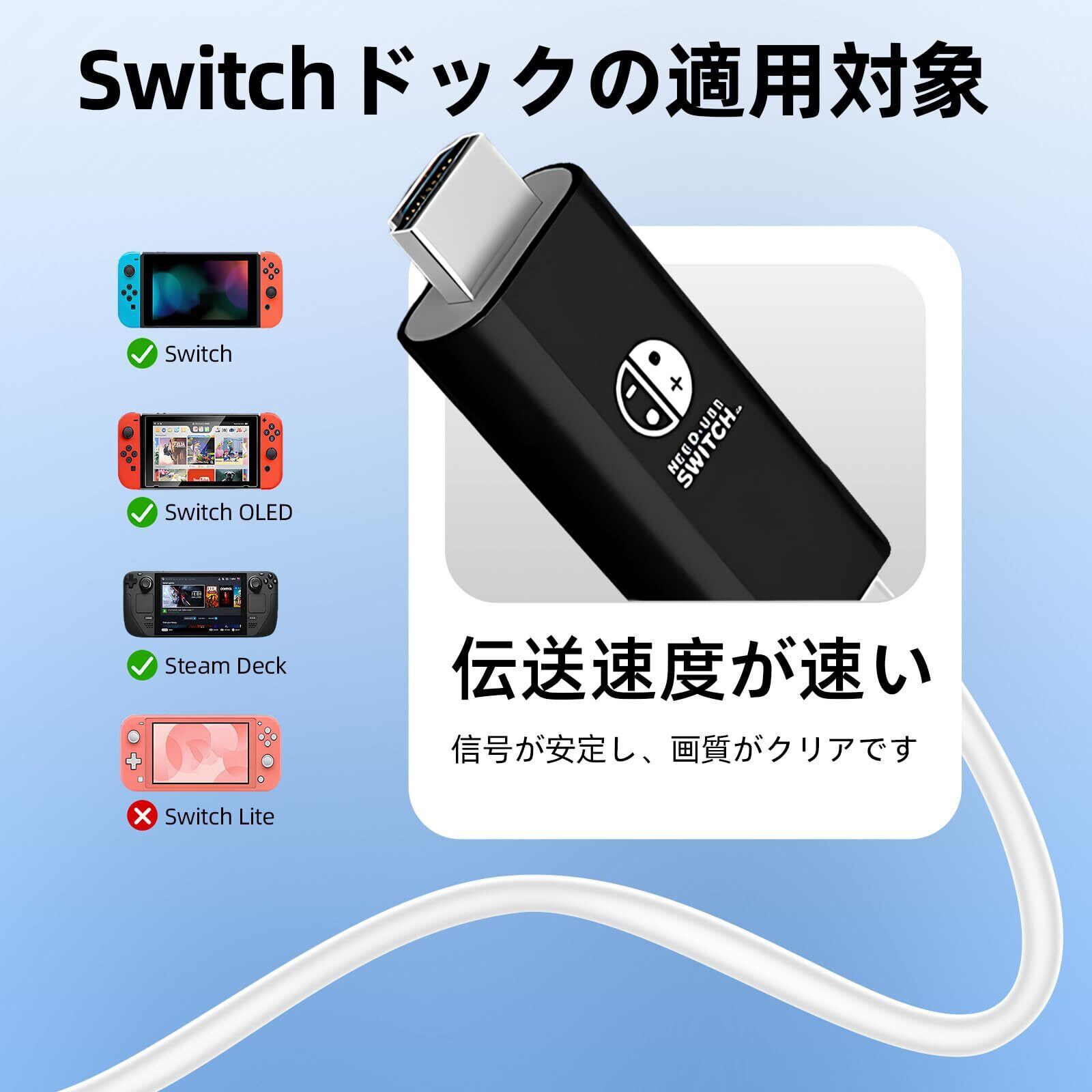 【高品質素材】 ドック不要で、直接テレビ出力が可能。ABS素材の外装に加え、多芯の錫メッキ銅ケーブルと認証済み高性能チップを採用。過熱や遅延を抑え、安定した映像出力を実現します。4K&60Hzの高解像度出力に対応(※Switch本体は最大4K&60Hzまで対応)。※YouTubeアプリの仕様上、本製品は動画出力に対応しておりません。