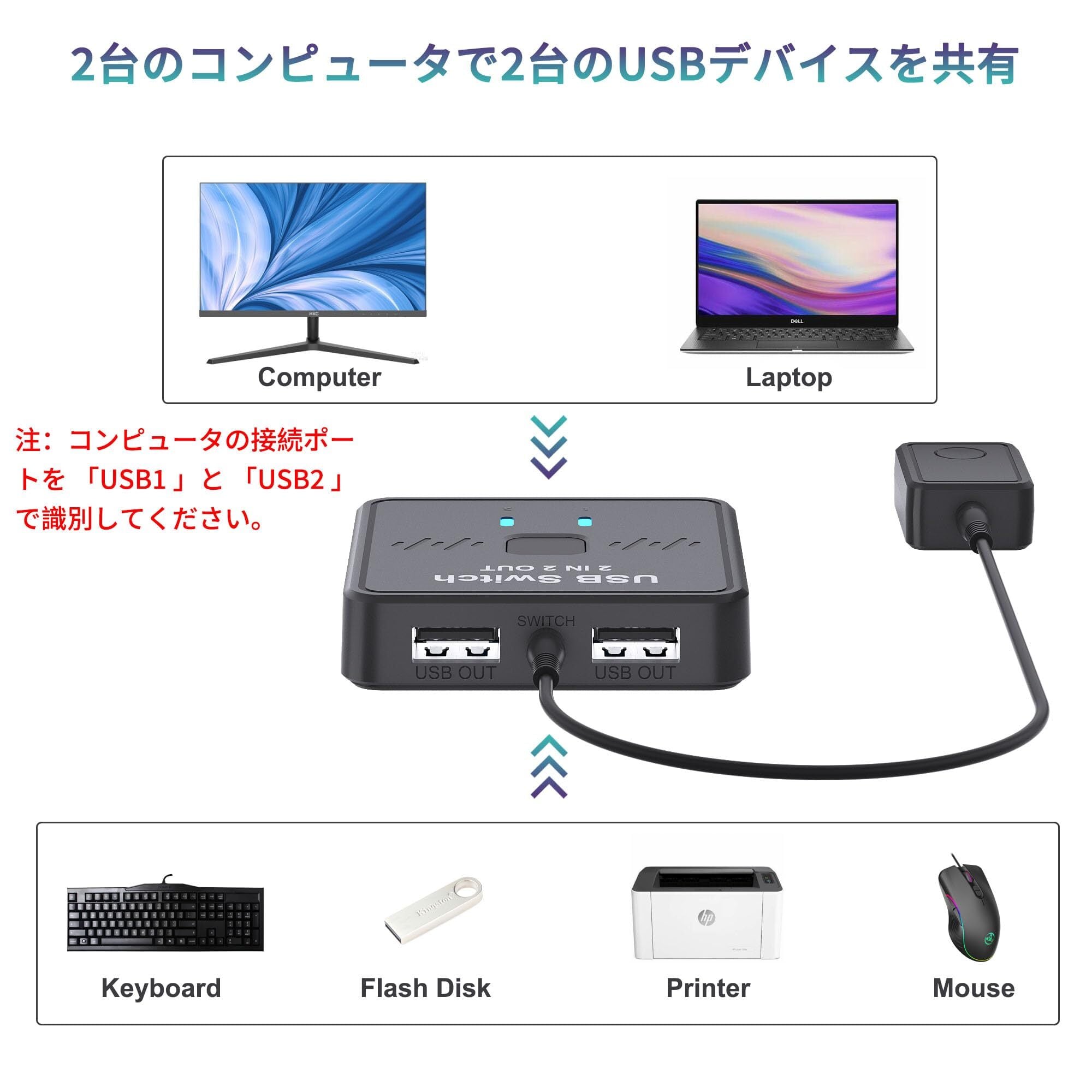USB 切替器 2台のPCで複数のデバイスを共有: 2入力2出力USB切替器は、キーボード、マウス、プリンタ、ウェブカメラなど、2台のUSBデバイスを共有する2台のPCでをサポートします。仕事用のパソコンと個人用のノートパソコンを自由に切り替えて、作業効率をアップさせましょう。