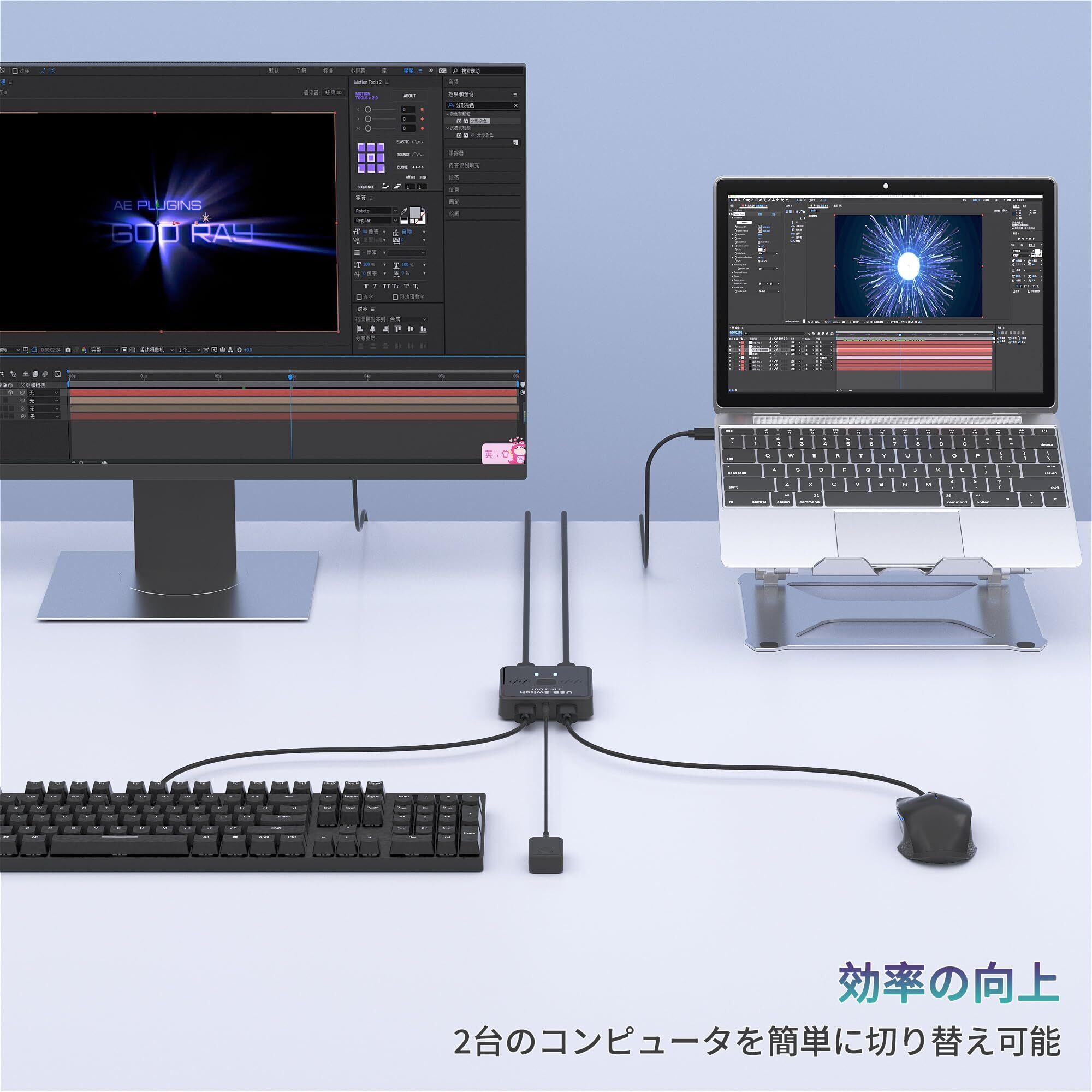 マウスとキーボードの共有 : 2台のコンピュータ間でマウスとキーボードを簡単に切り替えて、デスクトップのスペースを節約できます。マウスとキーボードを2セット用意する必要がありません。