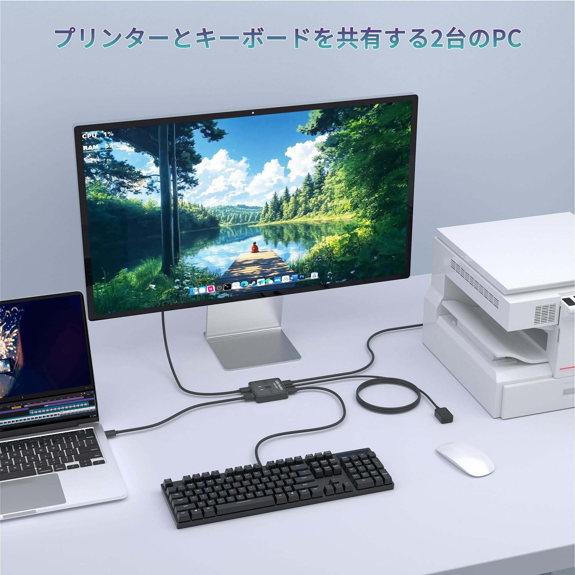 このUSB切替器を使えば、同時に2台のPCに対し、キーボードやマウス、プリンタを共有することができます。在宅勤務やオフィス環境、ゲームルームなど、さまざまなシーンで活躍します。
