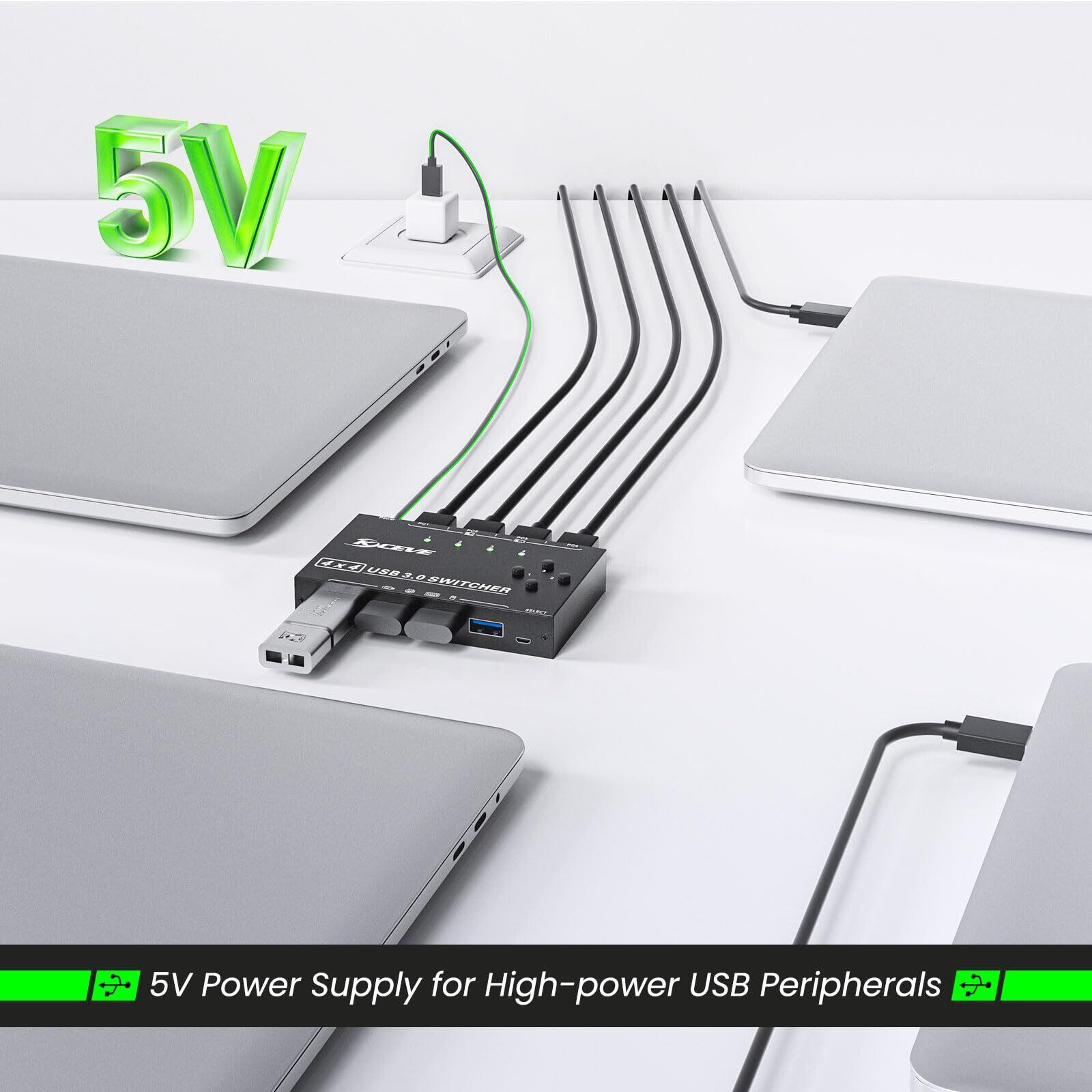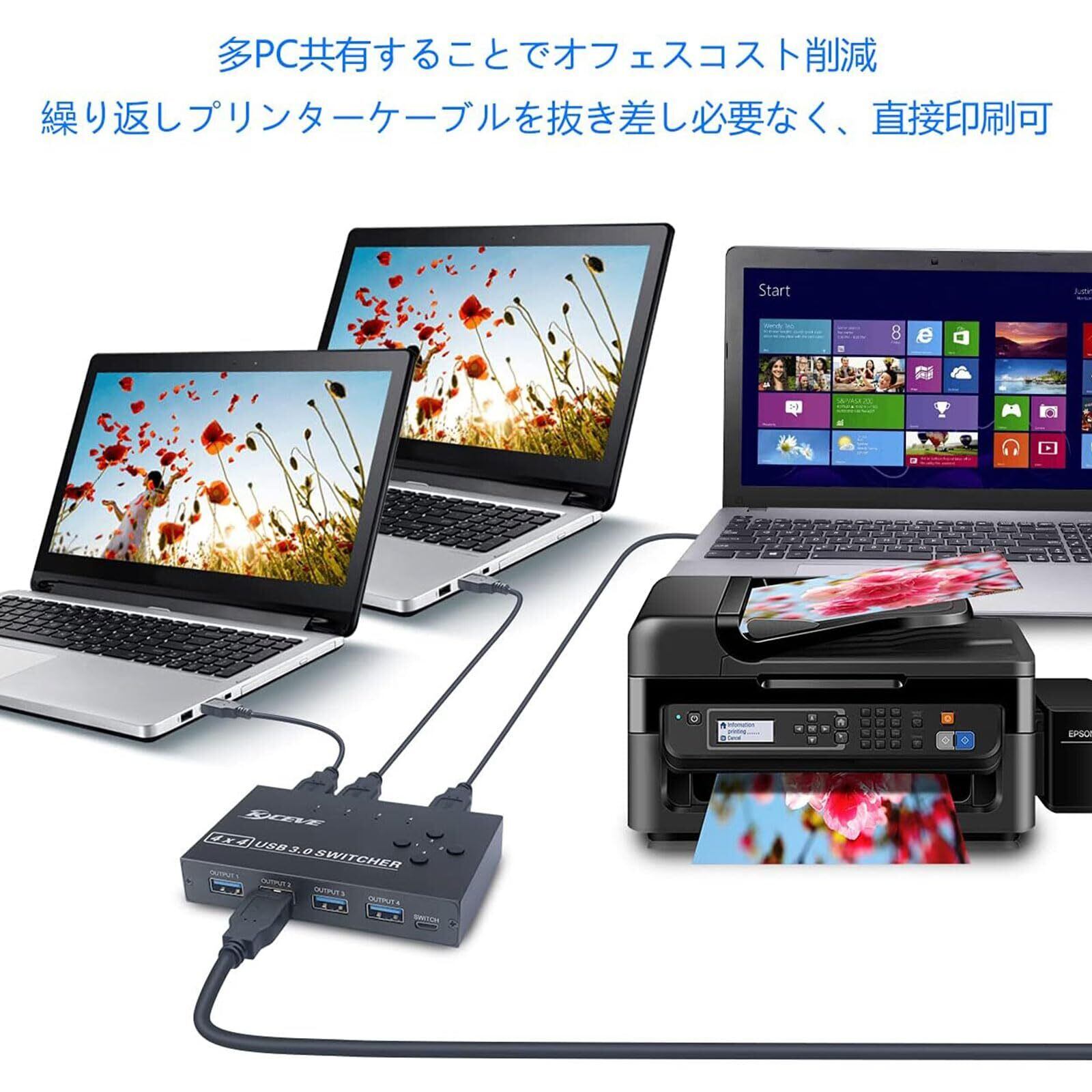 【USB切替器 PC4台用】USB3.0切替器は4入力4出力、USBデバイスが4台のコンピューター間で共有します。例えば、プリンター、スキャナー、マウス、キーボード、カードリーダー、フラッシュドライブをサポートします。ワイヤレスマウスとメカニカルキーボードもサポートします。(ご注意1:外付けハードディスクなどのハイパワー USB デバイスを接続する場合は、デバイスに電力を供給するために 5V/2A 電源アダプタを接続する必要があります。 パッケージには電源アダプタは付属しておりません。)