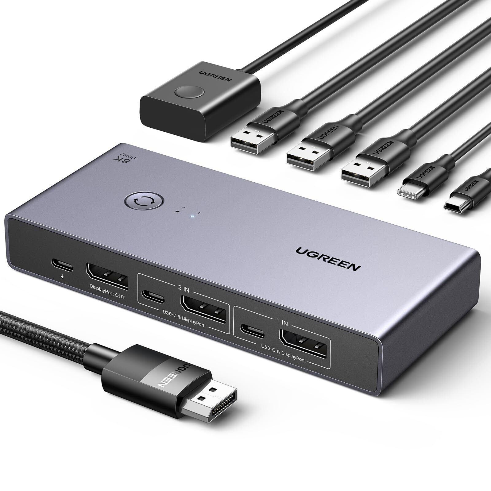 UGREEN 8K@60Hz Displayport KVM切替器 2入力1出力 DP1.4 USB 3.0ポート×4 (USb-A×3 + USB-C×1) 8K@60HZ対応 4K@240H対応 モニタ/キーボード/マウス/UsB Cハードドライブ/プリンタを共有、DPケーブル×2、Usb A to Cケーブル×2付き