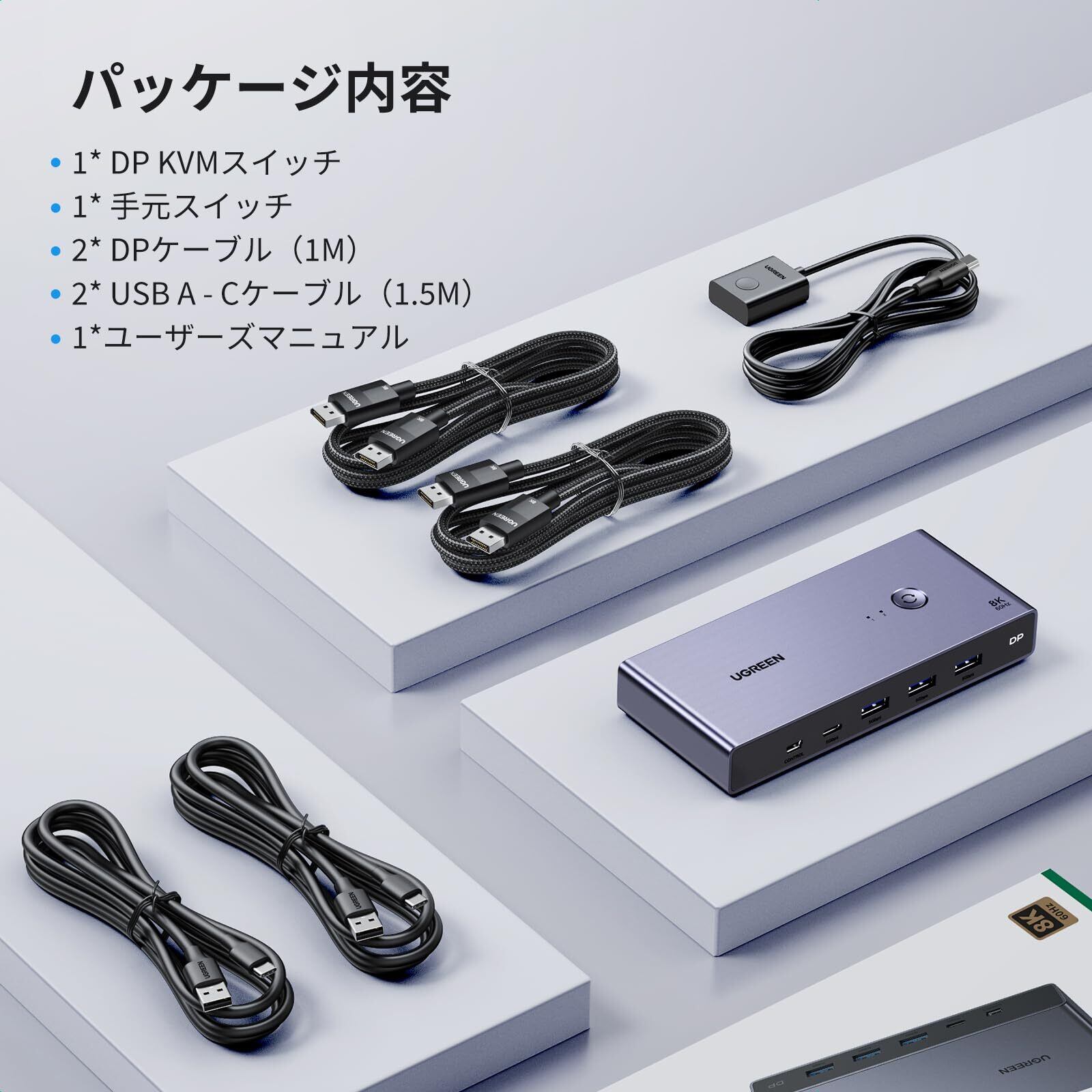 UGREEN 8K@60Hz Displayport KVM切替器 2入力1出力 | ディスプレイと周辺機器を簡単に共有!