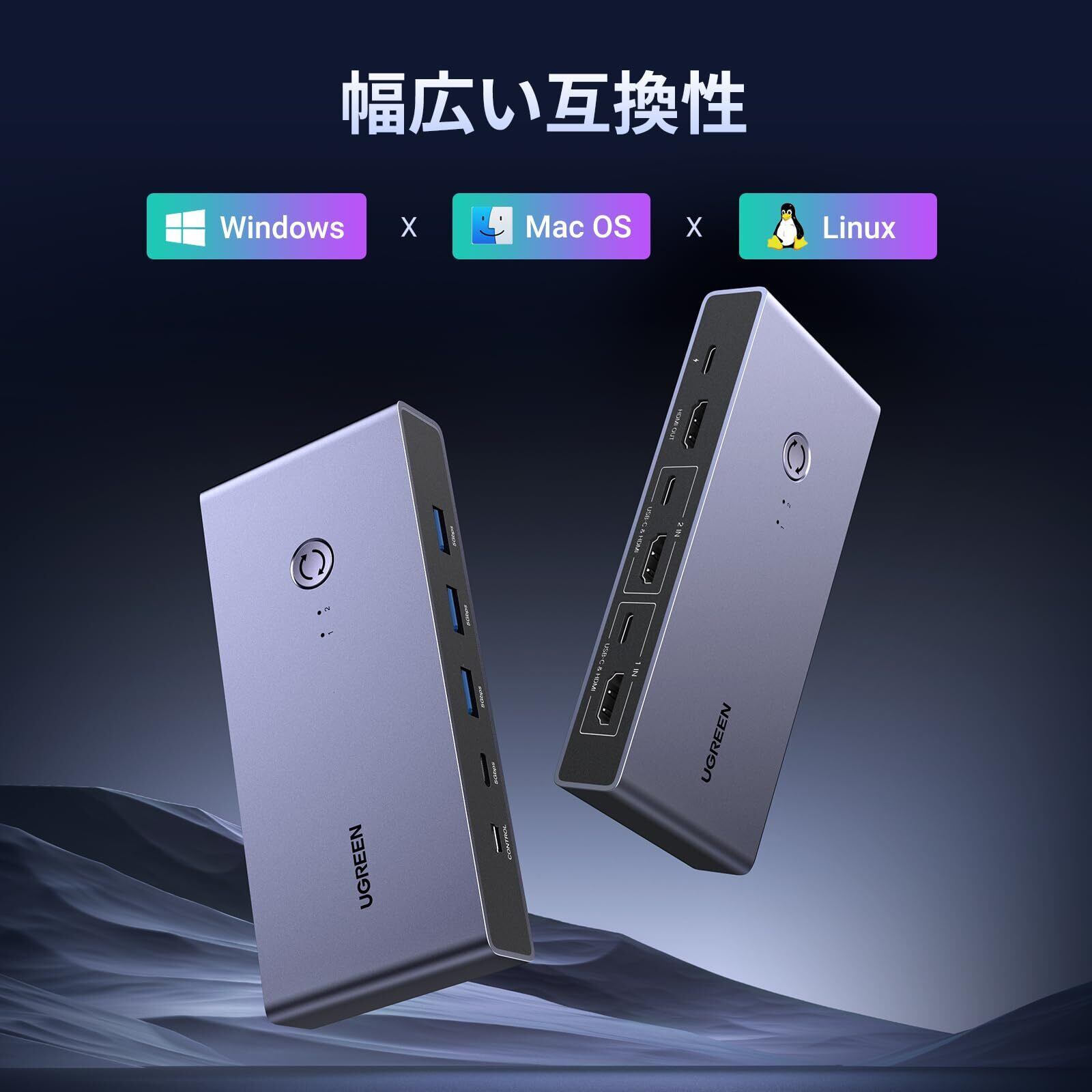 「UGREEN 8K@60Hz HDMI KVM切替器」は、2台のコンピュータと1台のモニターを簡単に切り替えて使用するための優れたスイッチです!USB 3.0ポートを3つ、USB-Cポートを1つ備えており、さまざまな周辺機器との接続もスムーズです。