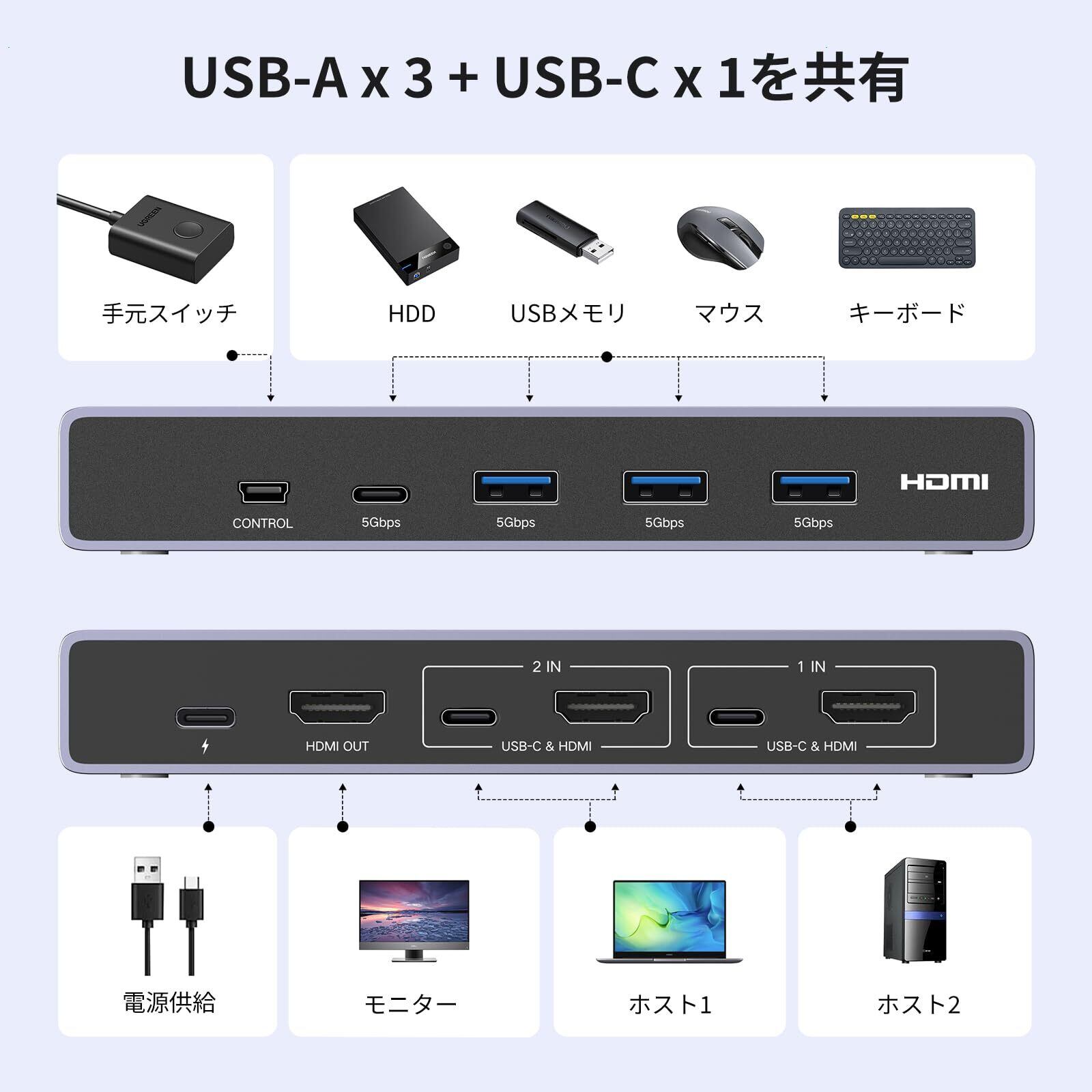 UGREEN 8K@60Hz HDMI KVM切替器 2入力1出力 PC2台をUSB 3.0ポートx3 & USb-Cポートx1 とモニター1台共有 KVMスイッチ 3D/CEC/HDRに対応 手元スイッチ & USBケーブル2本 & HDMIケーブル2本付き