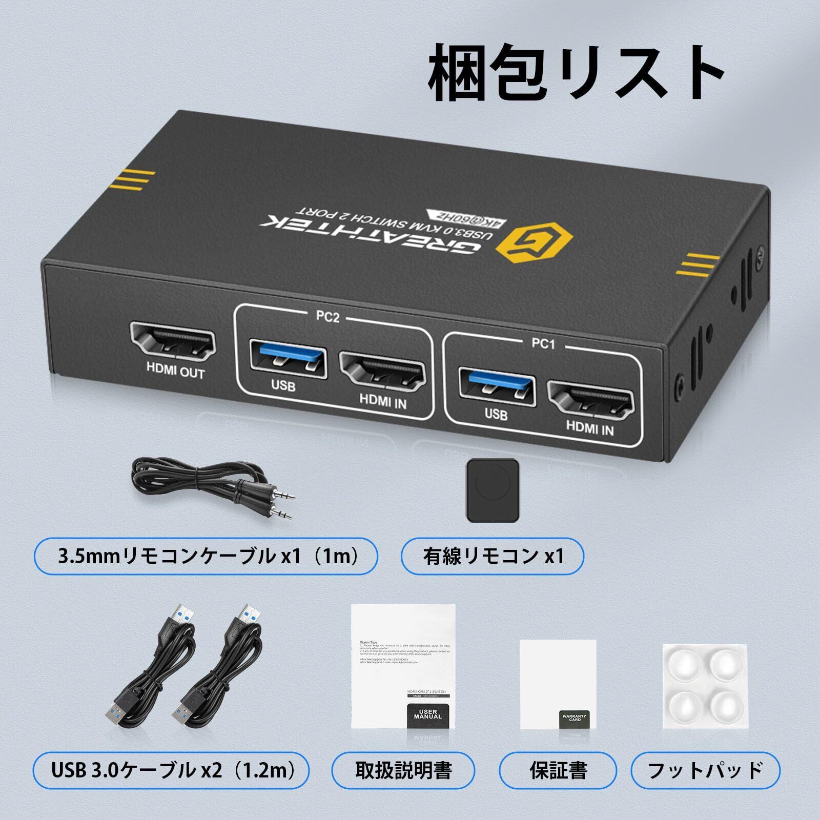USB3.0 KVMスイッチ、2台のPCを1台のモニターに接続、4K@60Hz解像度、HDMI KVM切替器 2入力1出力、ボタン&有線リモコン切り替え対応、仕事/会議/娯楽に最適