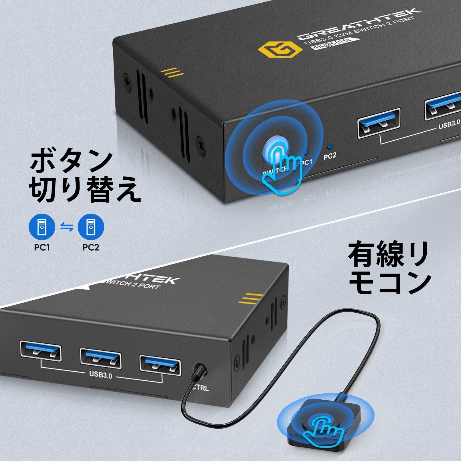 USB3.0 KVMスイッチ 2台のPCを1台のモニターに接続 | 4K@60Hz 解像度で快適な作業環境!