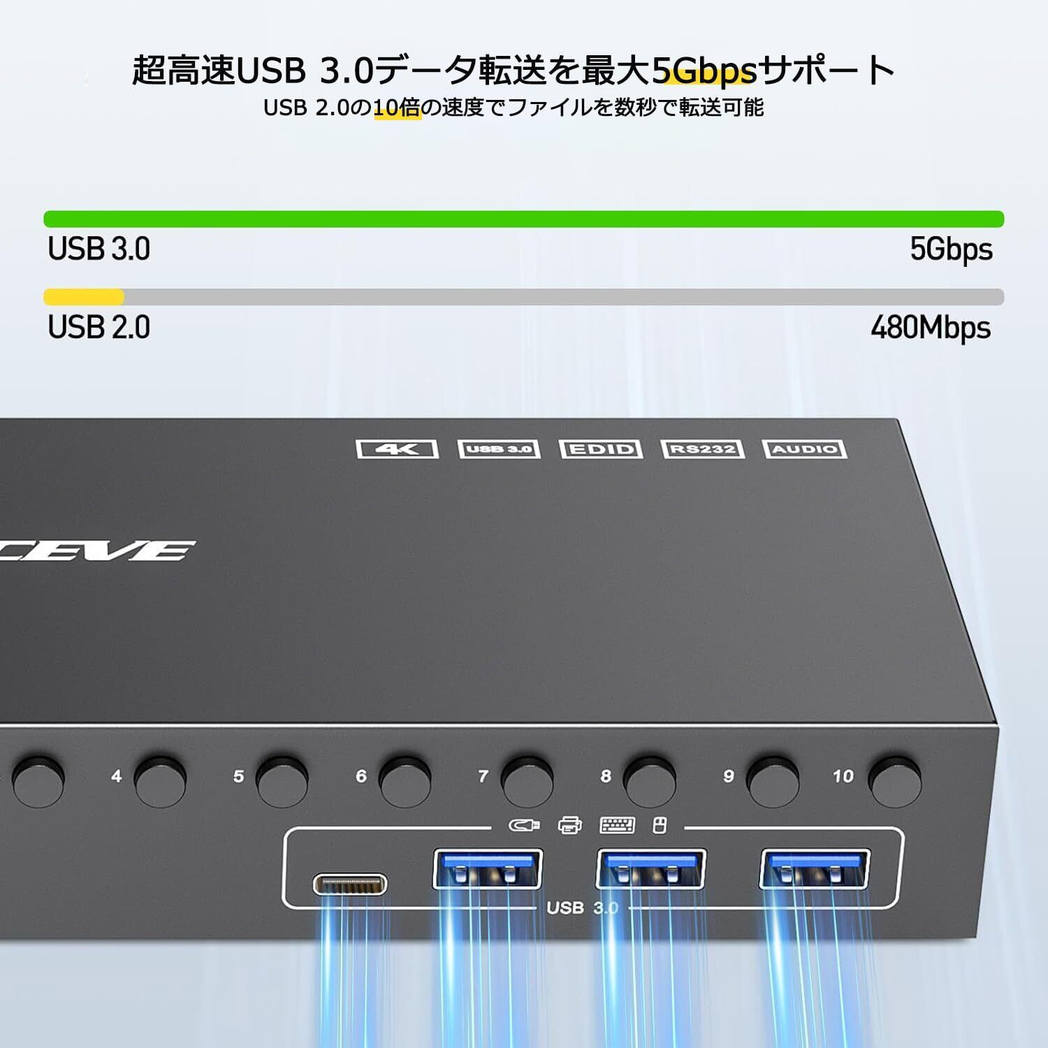 【10入力1出力HDMI KVMスイッチ】この10入力のKVMスイッチは、最大10台のパソコンを1つのモニターと1セットの有線またはワイヤレスのキーボード・マウスで共有可能。本体ボタン、付属の手元スイッチ、またはRS232で簡単に10台のパソコンを切り替えられ、4つのUSB 3.0デバイスも共有できます。