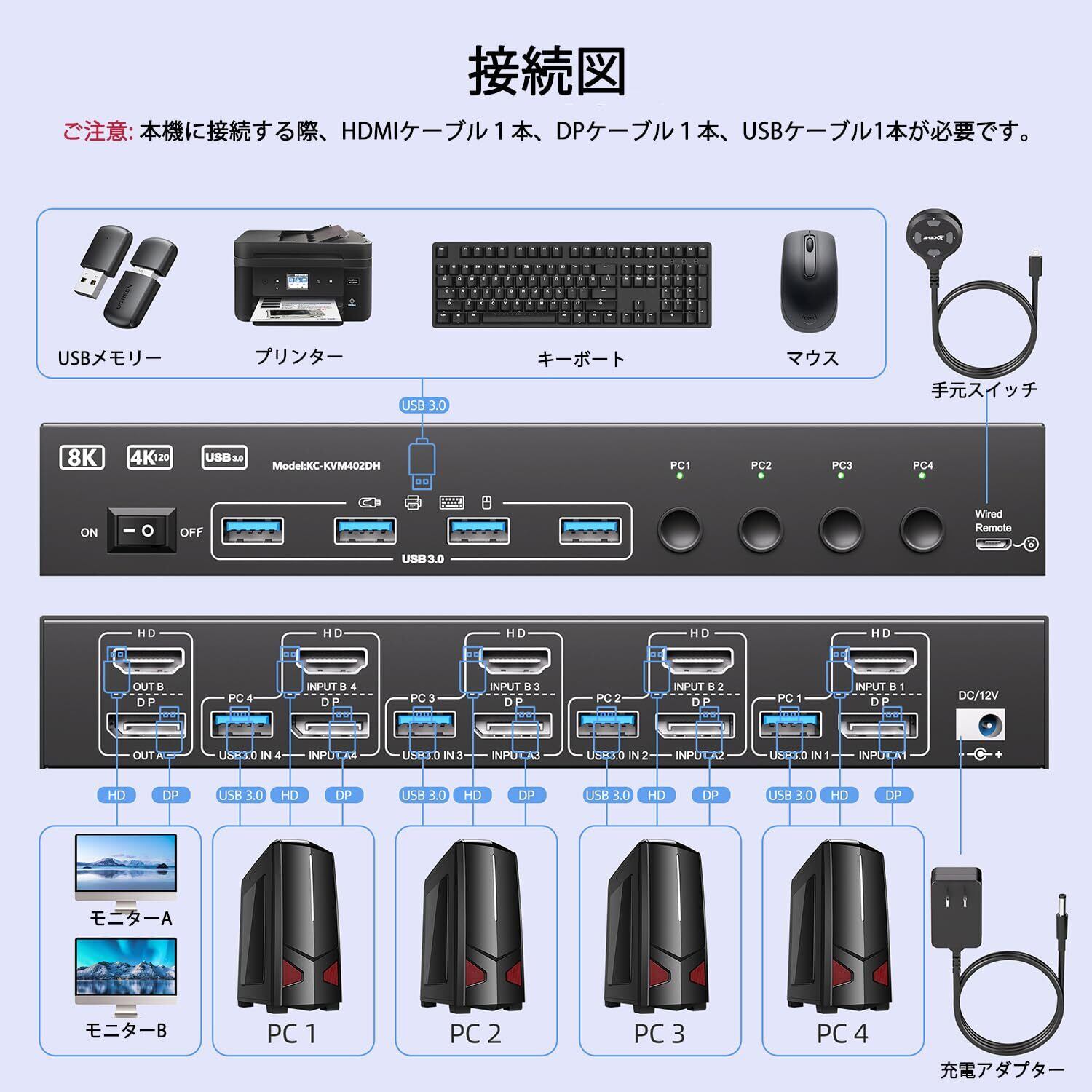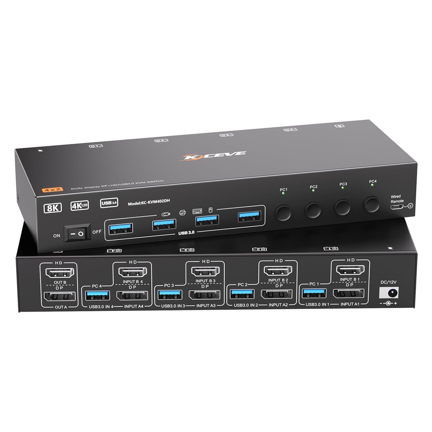KCEVE 8K@60Hz USB3.0 KVM切替器 4入力2出力、ミラー/拡張モード KVM Switch KVMスイッチ PC4台とモニター2台対応 キーボード、マウスを4PCで共有 ドライバー不要 簡単に接続 手元スイッチ付き(8K@60Hz/4K@144Hz)