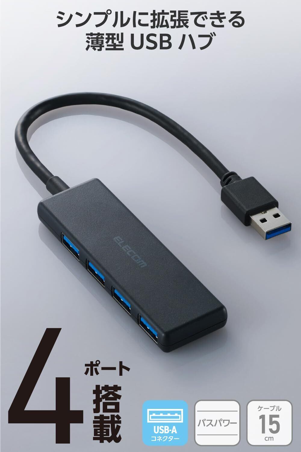 エレコム USBハブ USB-A接続 USB3.2(Gen1) 5Gbps 4ポート バスパワー 15cm ケーブル 小型・軽量設計 ブラック U3H-H042BK/E