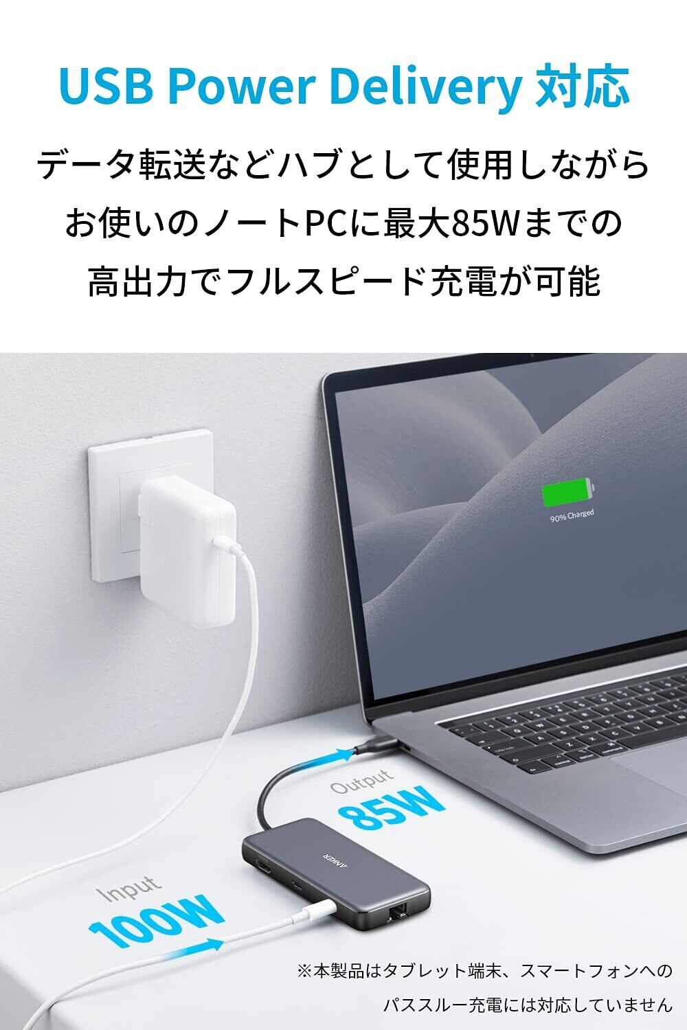 USB Power Delivery 対応:データ転送やHDMI接続などハブとして使用しながらも、お使いのノートPCに最大85Wまでの高出力でフルスピード充電が可能です。(15W出力はハブ自体への給電に利用されるため、最大入力は100W、最大出力は85Wです)※85Wで出力の場合は100W出力が可能な充電器をご利用ください。