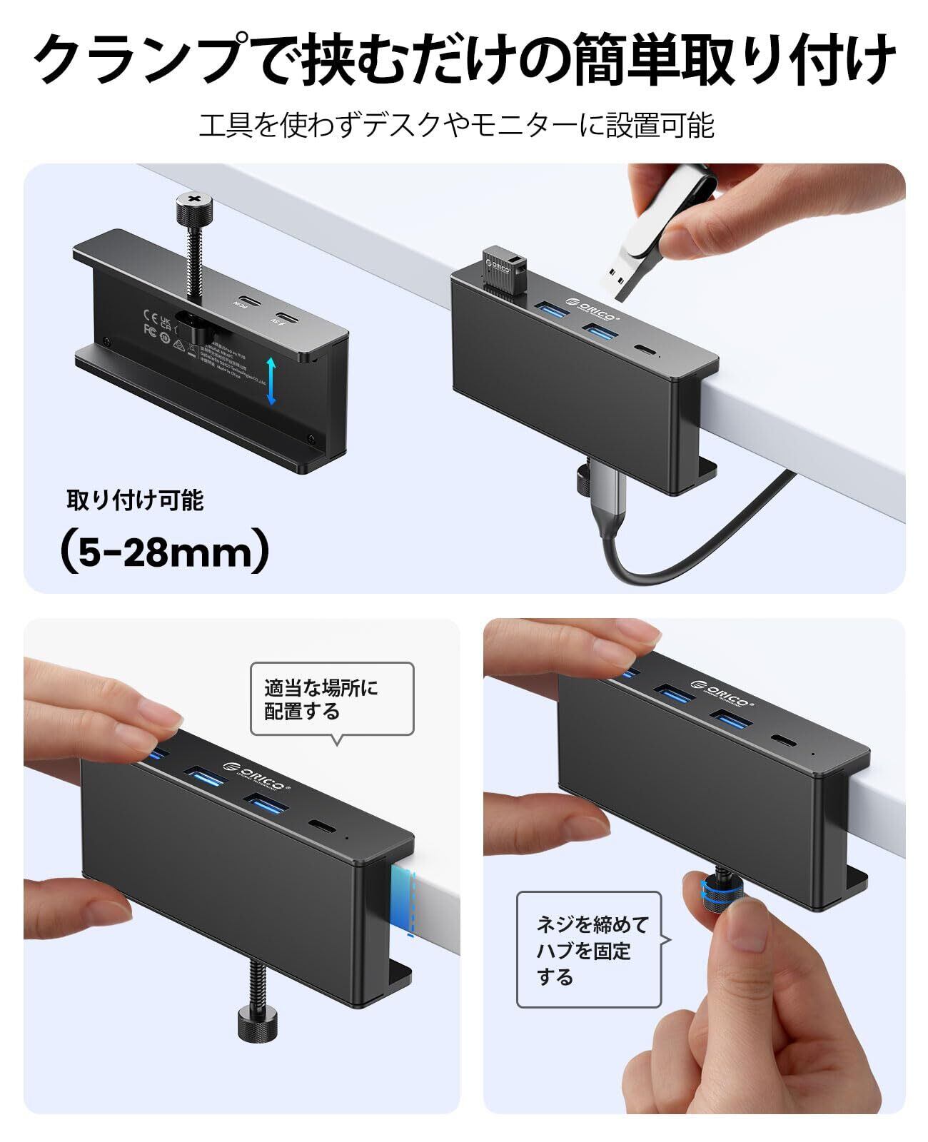 ORICO USB C ハブ クランプ 固定 usb hub 3.0 4ポート 5Gbps高速転送 USB-C 給電ポート付き(5V/3A) バスパワー/セルフパワー両対応 2-IN-1 1mケーブル付き アルミ クリップ式 USB拡張 USB増設 Windows/Linux/Mac OS対応 テレワー 在宅勤務 ブラック MH4PC