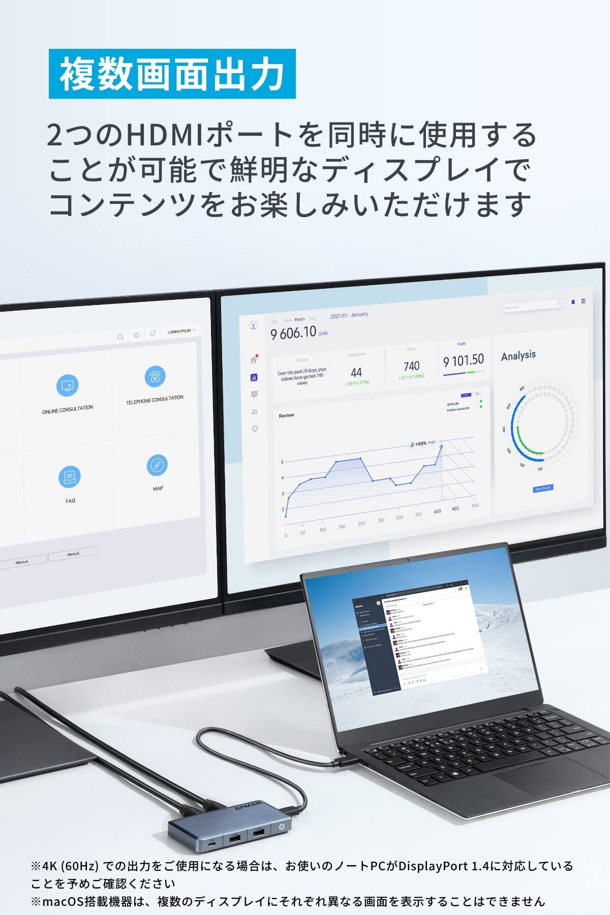 複数画面出力:単ポート利用時は4K (60Hz)での出力が可能です。同時に2画面へ最大4K (30Hz) での出力も可能です。 (※macOS搭載機器は、複数のディスプレイにそれぞれ異なる画面を表示することはできません。)