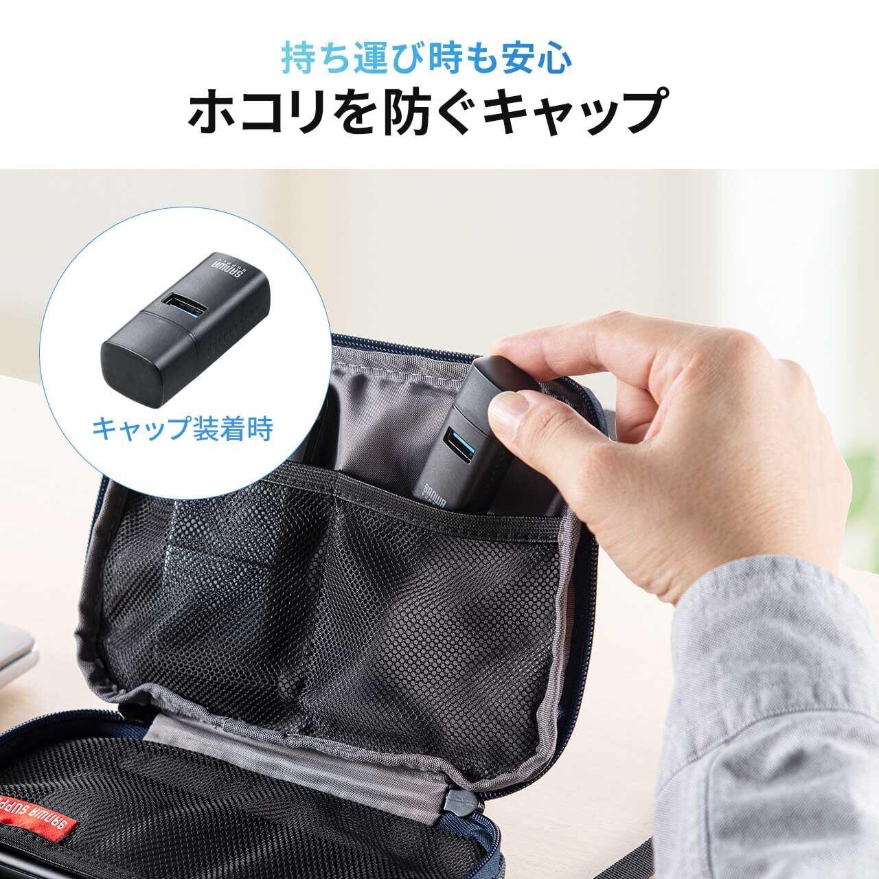 AC電源不要の バスパワータイプ です。USB端子を保護するキャップ付きです。