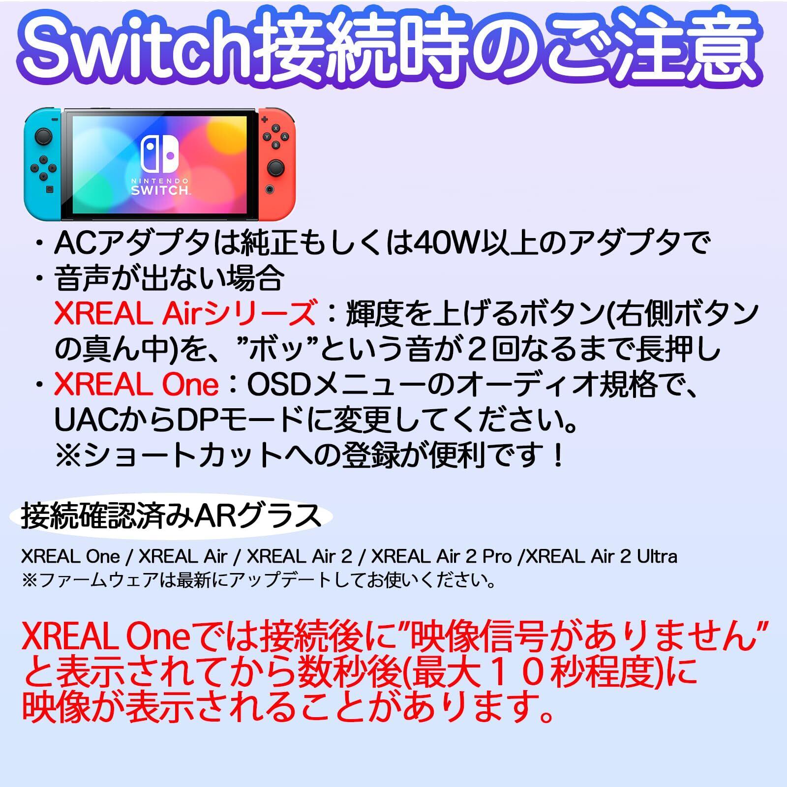 追記2:任天堂Switchの有機ELモデルとXrealOneの組み合わせではご利用いただけません。(Xreal 社純正のHUBも同じ症状となるようです)Switchの標準モデルとXrealOneの組み合わせや、有機ELモデルとXreal Airシリーズの組み合わせは問題ありません。