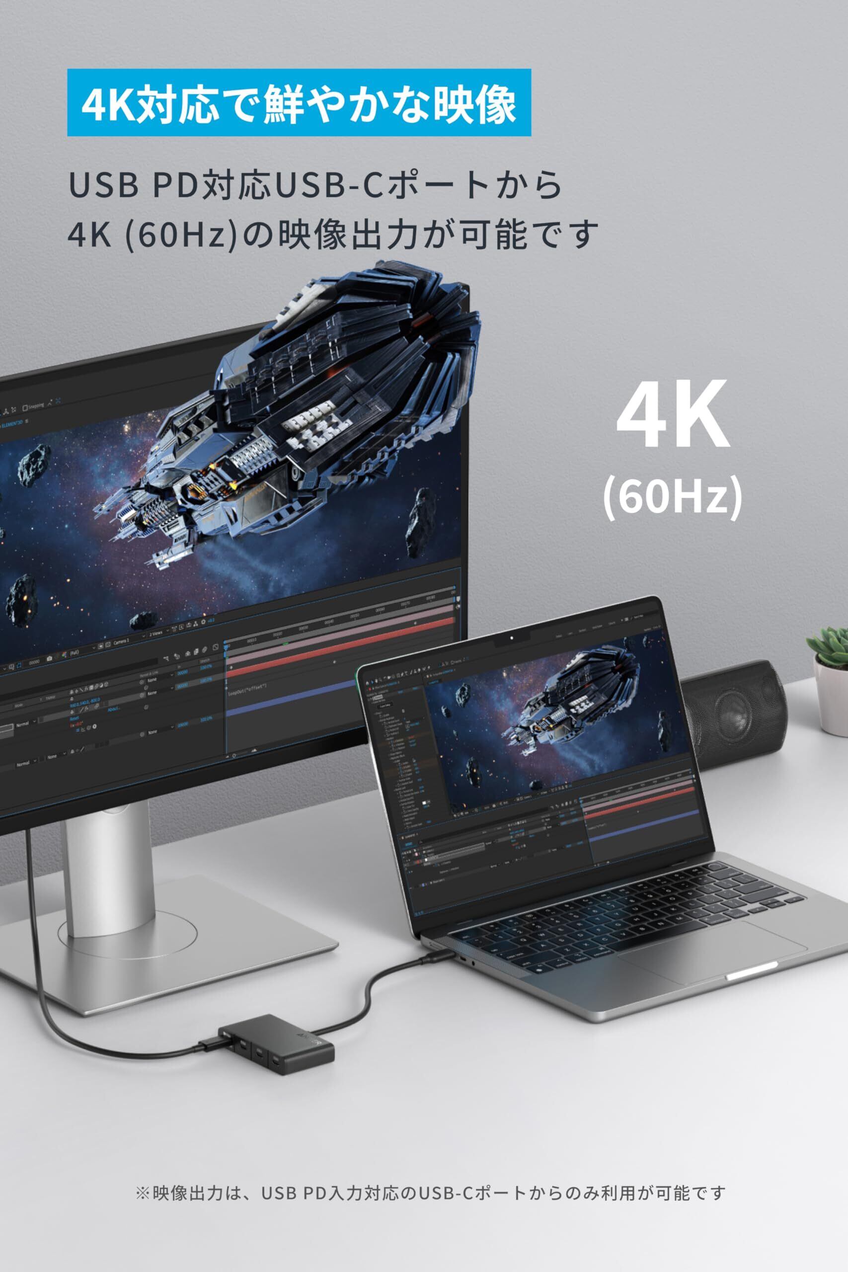 4つのポートを1つに: 4K (60Hz) 対応・USB PD 100W出力対応 USB-C ポート1つ、高速データ転送用USB-Cポート3つへの接続がこれ一台で可能になりました。(※4K (60Hz) 対応の映像出力は、USB PD対応のUSB-Cポートからのみ利用が可能です。ご使用の機器の互換性を必ずご確認ください)