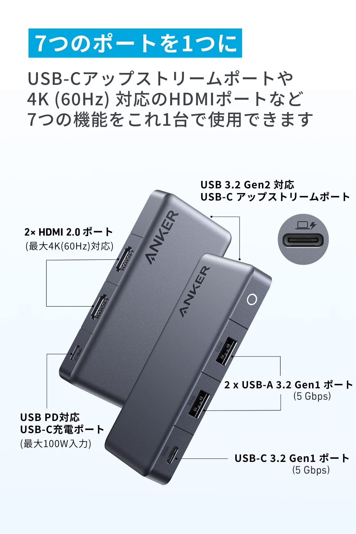 Anker 343 USB-C ハブ (7-in-1, Dual 4K HDMI) 100W USB PD対応 4K HDMI 2画面出力 約50cm 着脱式ケーブル 5Gbps 高速データ転送 USB-C USB-Aポート搭載