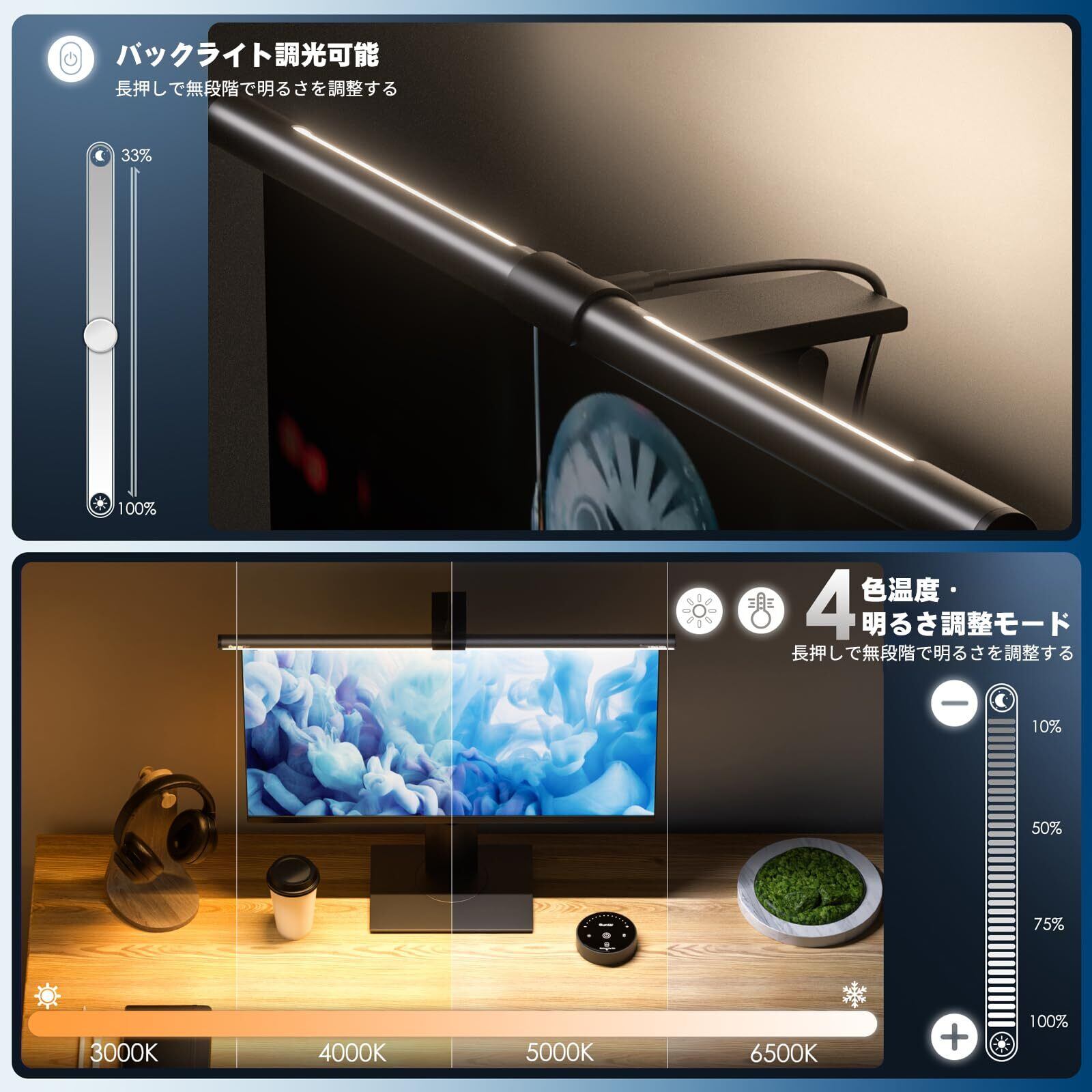 このモニターライトは4種類の色温度(クールホワイト、ナチュラルホワイト、ウォームホワイト、暖色)を選べ、シーンや気分に合わせて柔軟に調整が可能。無段階調光機能も搭載しているため、最適な明るさを瞬時に設定できます。作業や読書、リラックスタイムなど、さまざまなシーンで活躍します。