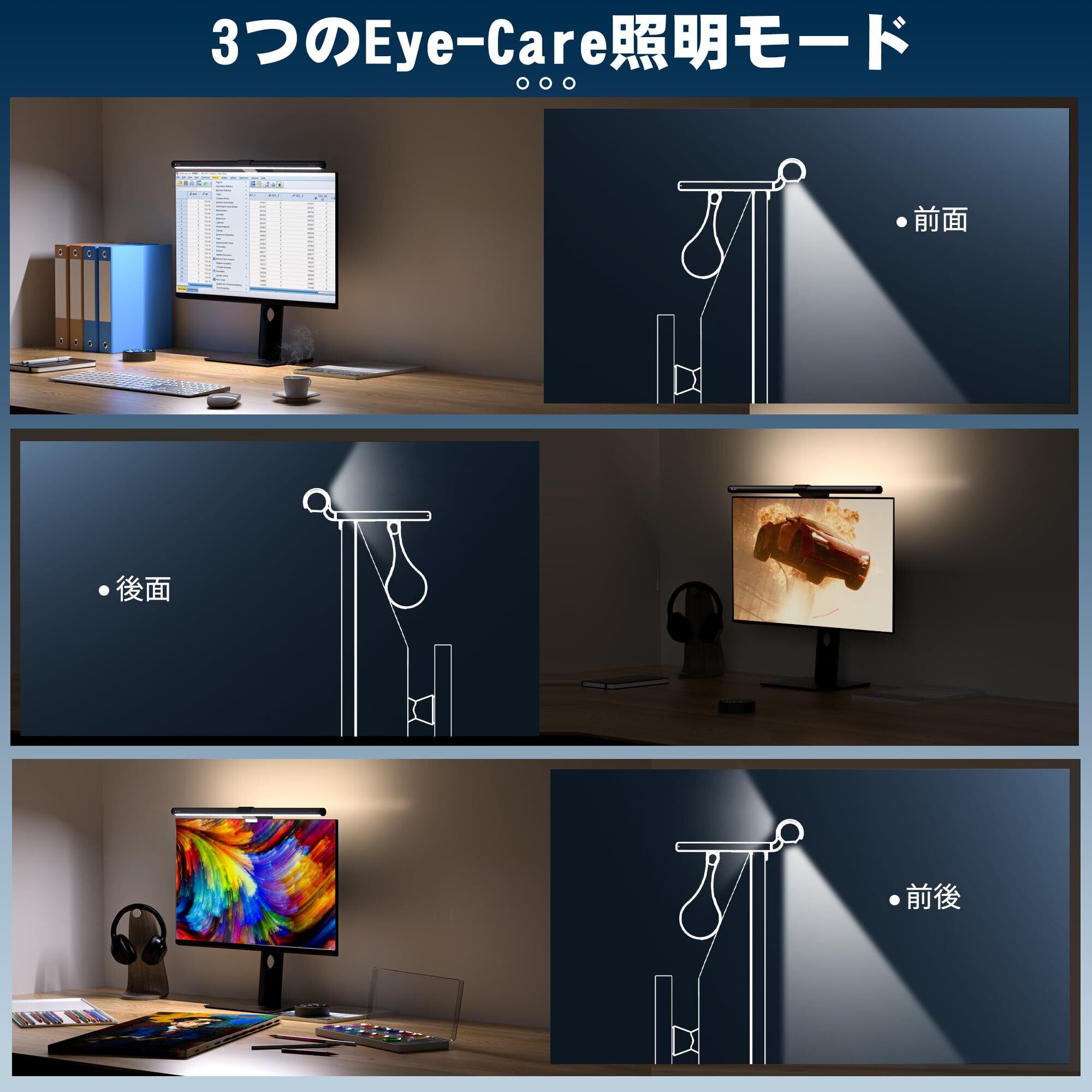 【3つのEye-Careモード】 Quntis USBデスクライトは、背面照明で部屋の明るさやムードを調整し、前後の光源を統合した革新的な照明モードで眩光を最小限に抑える。デスクトップでの作業に集中するためには前面ライト、リラックスしたい場合はバックライト、均一な照明が必要な場合は前後照明モードを選択できる。要するに、このモニター掛け式ライトは、作業中でもリラックス中でも、総合的な目の快適性を向上させることができる。
