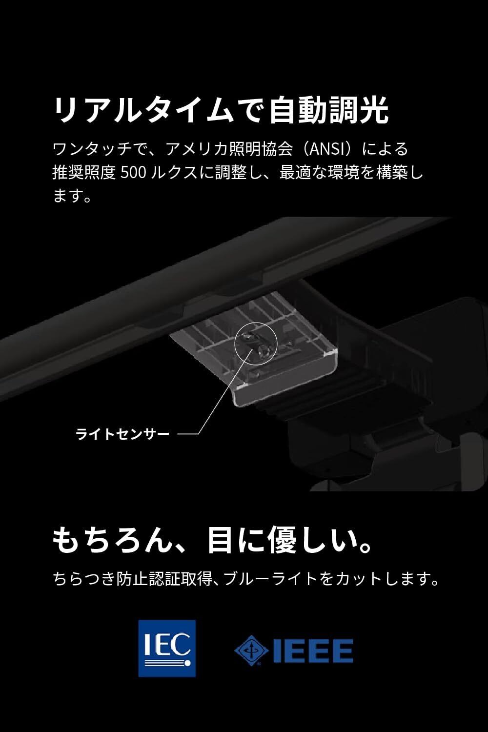 スマートで細かな明るさ調節:色温度・明るさを無段階で調節できるほか、自動調光機能で500ルクスの照明環境を維持。直径60±10cm内の動きを検知し自動点灯・5分単位で指定された時間に感知がないと、自動消灯する機能が備わっています。