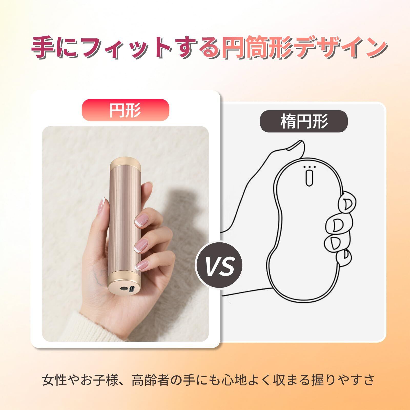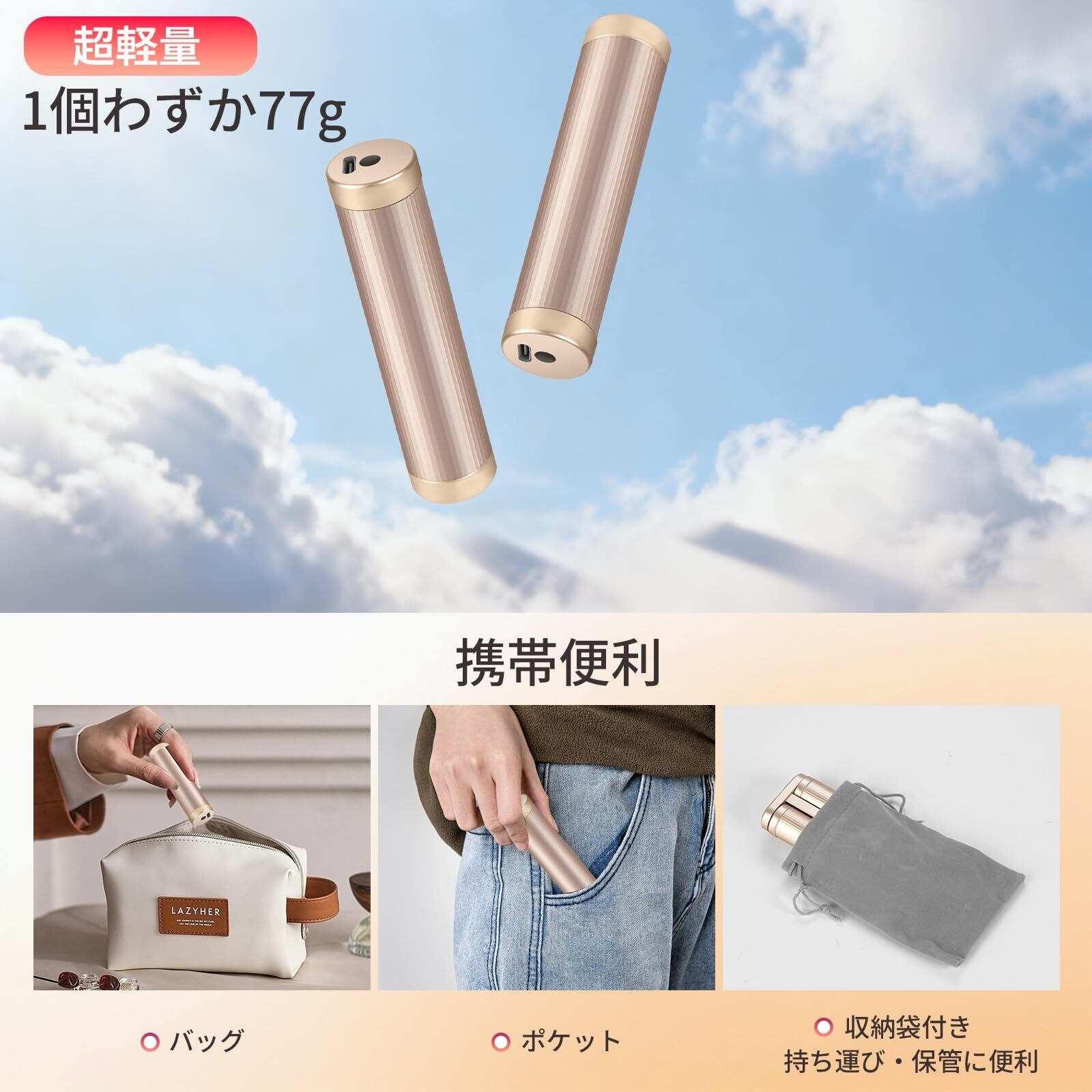 【超軽量・快適デザイン】1個わずか約77gの超軽量設計で、女性やお子様でもストレスなく使えます。二個を組み合わせた時の本体サイズは約100×50×23mmと薄型設計で、手のひらにちょうど収まるコンパクトサイズです。表面には滑り止め加工を施し、握りやすく落としにくい仕様です。丸みを帯びた人間工学デザインで手触りも良く、長時間の使用でも快適にご利用いただけます。さらに、専用の収納袋が付属しているため、持ち運びや保管も便利です。上品なホワイト・シャンパンゴールド・ブラックの3色展開で、性別や年齢を問わずお選びいただけ、冬の贈り物やギフトにも最適です。通勤・通学・アウトドア・スポーツ観戦など、さまざまなシーンで大活躍します。