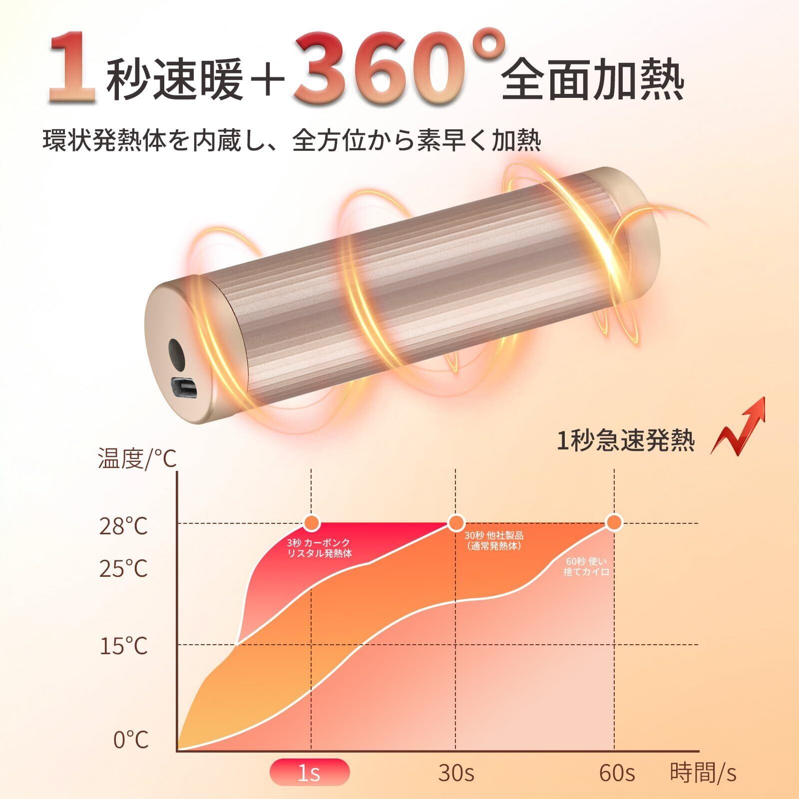 【1秒速暖&360°全方位発熱】当社の充電式カイロは、最新の高効率カーボンクリスタル発熱体とアルミ合金+ABS樹脂ボディを採用。スイッチを入れるとわずか1秒で全体が発熱し、手のひら全体や指先までしっかり包み込むように360°全方位から均一な暖かさを届けます。さらにアルミ合金は保温性にも優れており、電源を切った後でもしばらく余熱が残り、じんわり心地よさが続くのも大きな特長です。従来の市販カイロに多く見られる「両面発熱のみで中央が冷たい」「暖まりにムラがある」といった不満を解消し、より快適で安心して使える次世代モデルに仕上げました。寒い冬の通勤・通学やオフィスワークはもちろん、キャンプ・アウトドア・スポーツ観戦など幅広いシーンで大活躍。まるで小型ヒーターを持ち歩いているような贅沢な暖かさを実感できます。