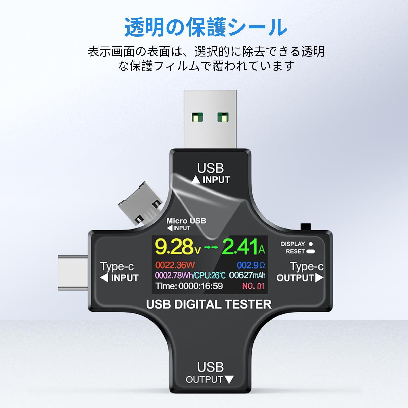 マルチインターフェース表示:このtypecテスターは複数ページにデータ表示します。IPSカラースクリー表示簡単にはっきりと見ることができます。スリープモードは夜間に使用できます。 このUSB電圧電流チェッカーの表面は、選択的に除去できる透明な保護フィルムで覆われています。
