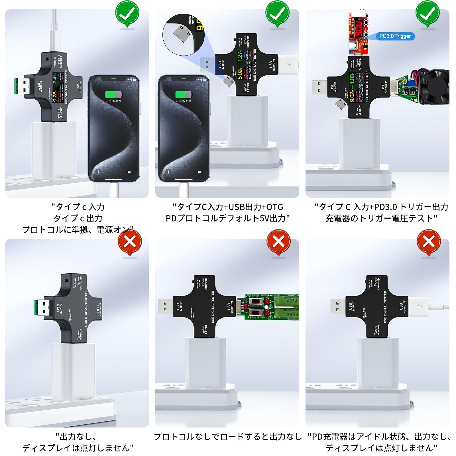 色々な急速充電プロトコルの検出でき:QC2.0/3.0、Huawei FCP/ SCP 、APPLE2.4A/2.1A/1A/0.5A、android DCP0、Samsung AFCなど急速充電検出をサポートします。 PD3.0/2.0 急速充電プロトコル中の電気信号監視できます。
