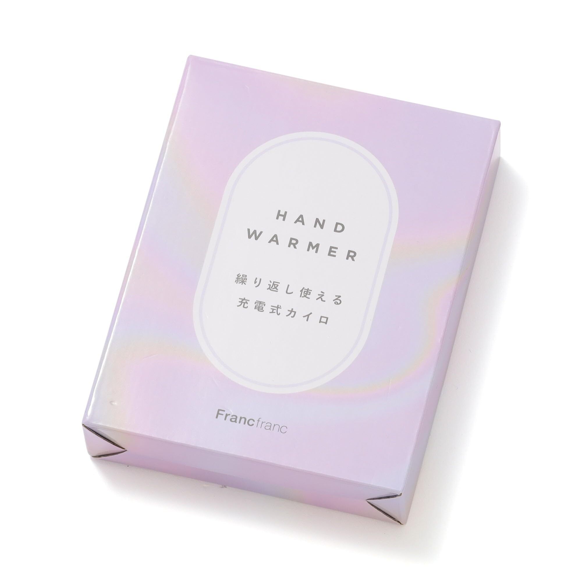 「使い捨てない」カイロです。スイッチを入れたらわずか10秒で温まり、最大約5時間持続します。充電式なので繰り返し使うことができ、経済的です。暖かさは強(約50℃)・弱(約45℃)の2段階で調整できます。付属のUSBコードをACアダプターやパソコンに繋いで充電でき、モバイルバッテリーとしても利用可能です。(2025年モデルから充電コードがtypeC-Cに変更になりました。)カラーバリエーションを豊富に揃え、ワンポイントにFrancfrancのロゴをあしらいました。ころんとした形がかわいいオーバルの本体は手に馴染みやすく実用性も抜群です。
