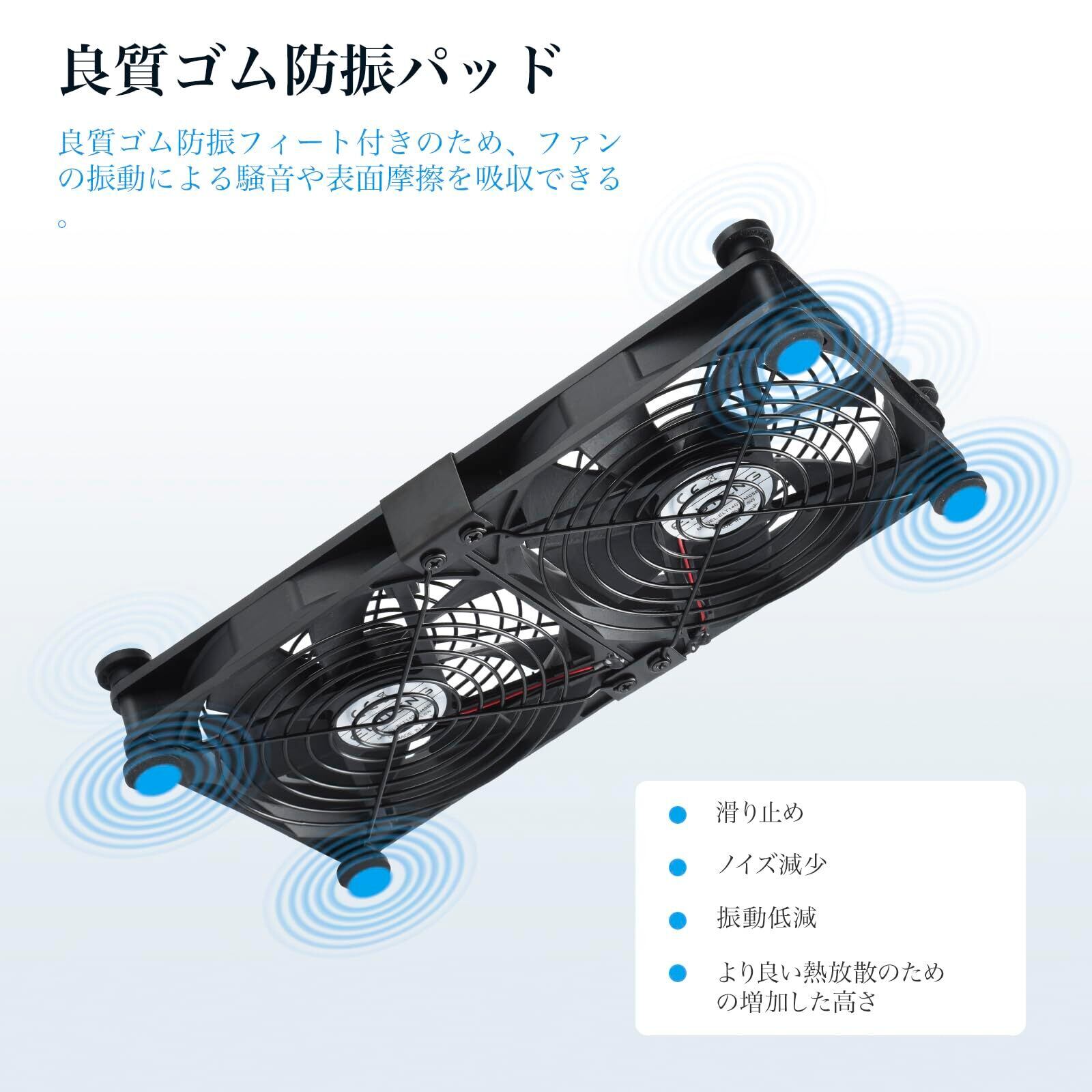【緩衝パッド付き&安定した風量】シリコン製の緩衝パッド付き、音や振動を抑えるだけでなく、滑りにくさも兼ね備えています。7枚羽根で安定した風量を確保します。パソコン、ルーター、HDDなどの機器はもちろん、AV機器やゲーム機などの電子設備を速やかに冷却できます。