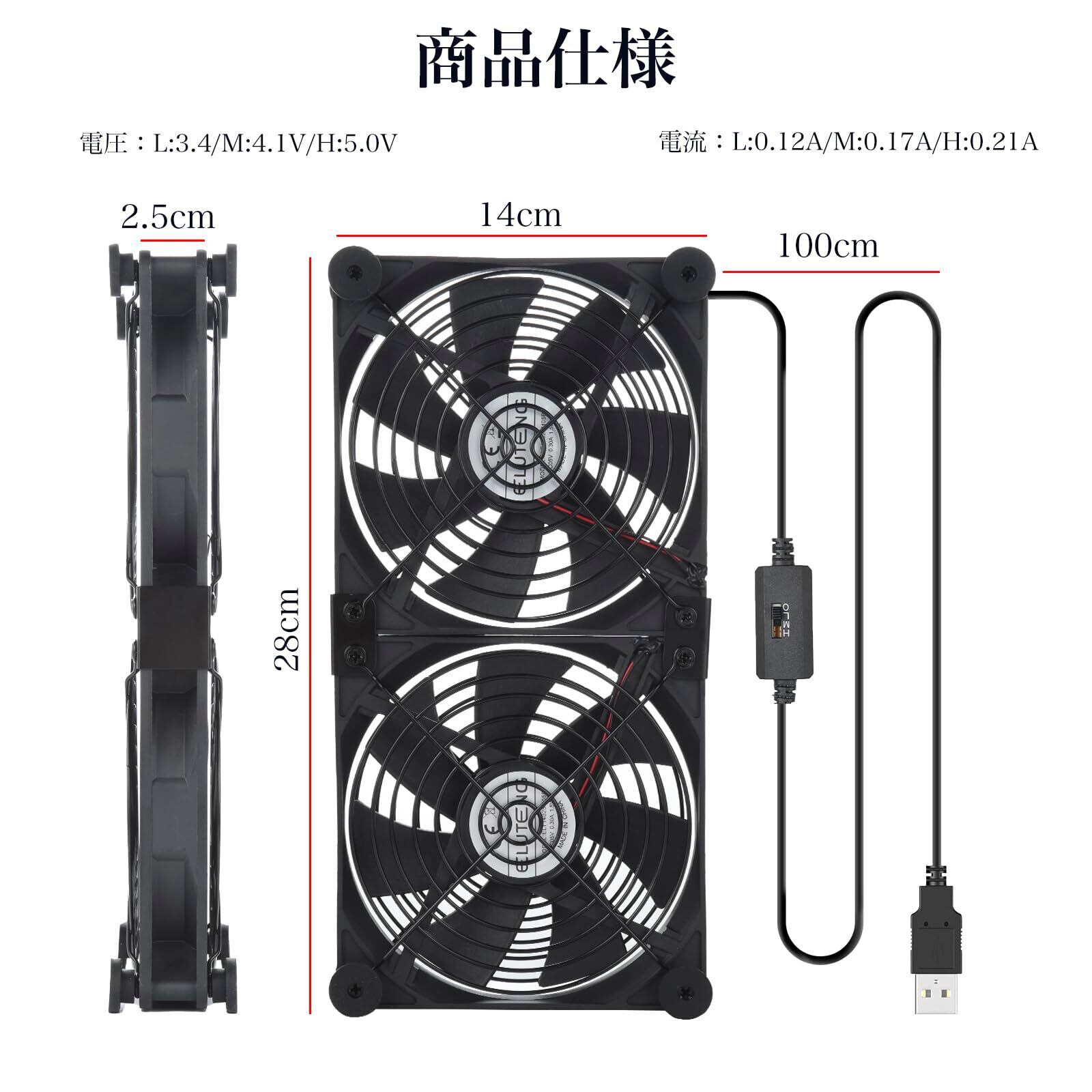 ELUTENG USBファン 14cm 2連 静音 USB 冷却ファン 防振ゴム足付き 3段階風量調節 薄型 USB扇風機 長寿命 5V 2連 1500RPM パソコン/ノートパソコン/ルーター/水槽など冷却