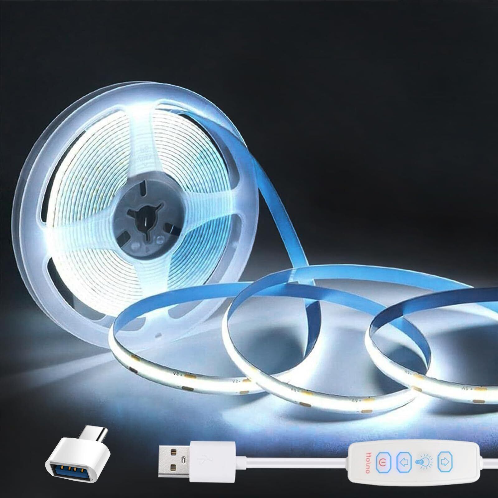 ledテープライト COB LEDストリップ USB 5v 320LEDs/m 調光スイッチ 10段階調光 カット可能 高輝度 両面テープ設置 幅8mm 2M 6000k 昼白色 USB-TYPE C転換