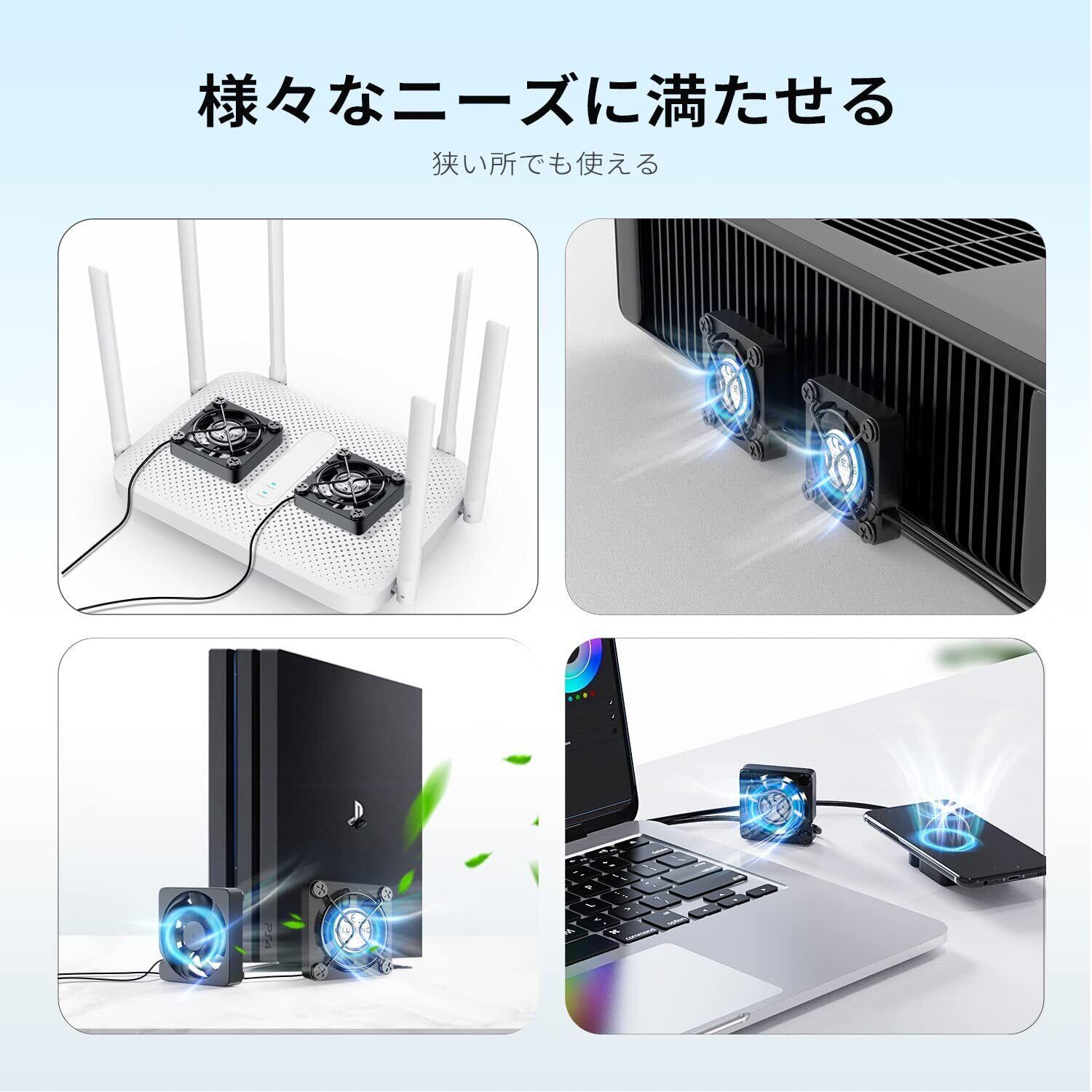 【7枚羽根&安定した風量】7枚羽根で安定した風量を確保します。パソコン、ルーター、HDDなどの機器はもちろん、AV機器やゲーム機などの電子設備を速やかに冷却できます。USBファンサイズ:4 ×4 × 2.5cm(金属フレームを除く)、ミニ・軽量の設計を採用して、パソコンホストやルーターなどの設備を冷却できます。卓上以外、小さな隙間でも電子製品を冷却します。ご注意:4cmファンは小型で、放熱効果を出すために速度が上がるため、使用時に多少騒音があります。