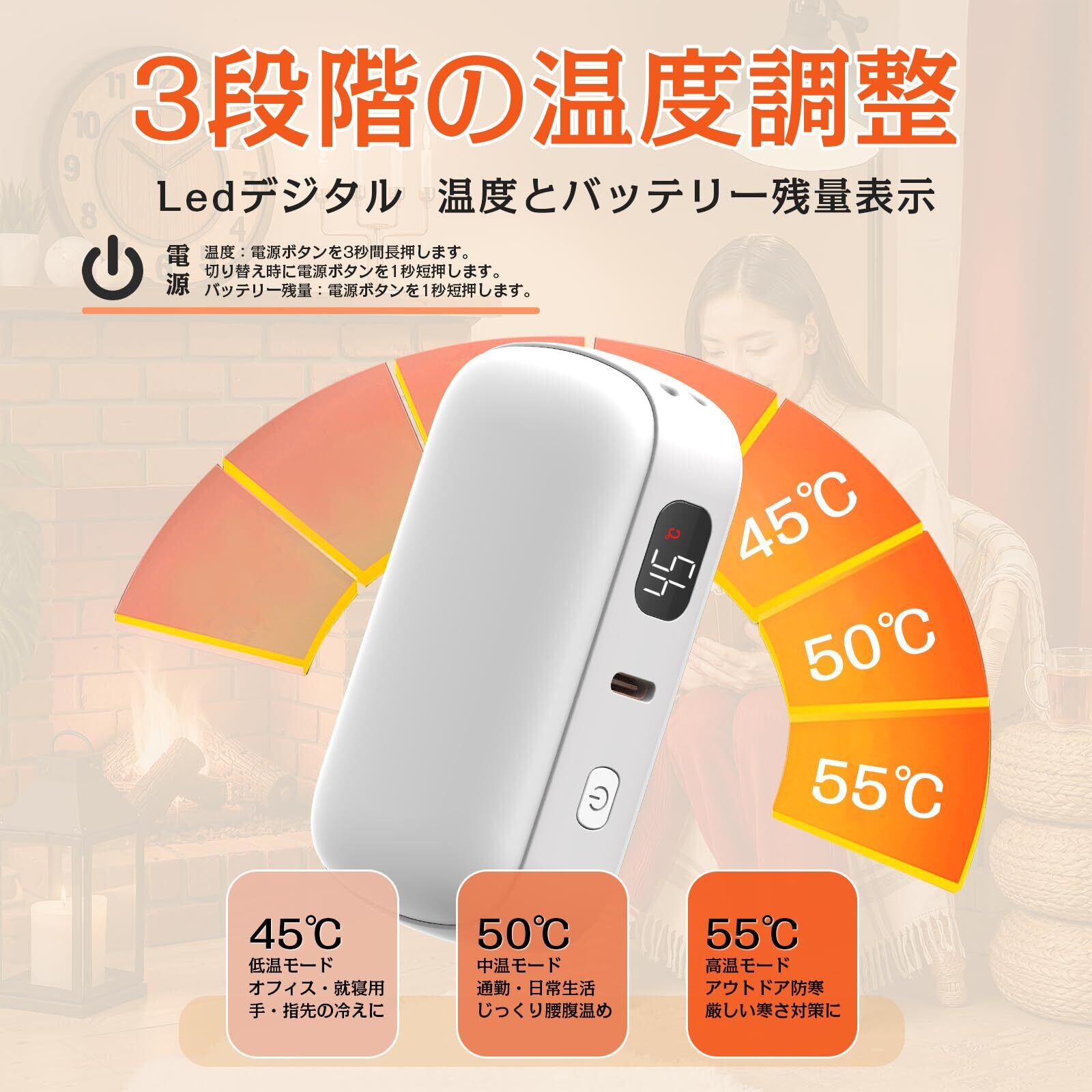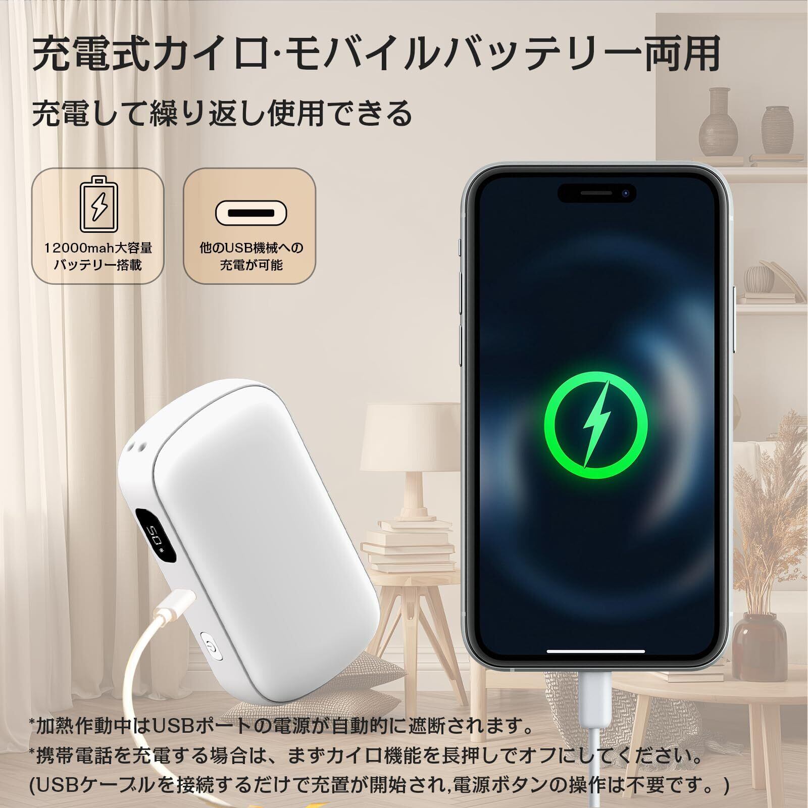 【2025新登場】充電式カイロ 12000mAh大容量 モバイルバッテリー機能付き 2面急速発熱 長時間連続使用 3段階温度調節 電気カイロ 小型 コンパクト 5V/2A急速充電 LEDデジタル表示 USB充電式 PSE認証済み 携帯 繰り返し利用 携帯便利 寒さ対策 防寒 アウトドア 通学 出張 旅行 通勤オフィス用 プレゼント (ホワイト)