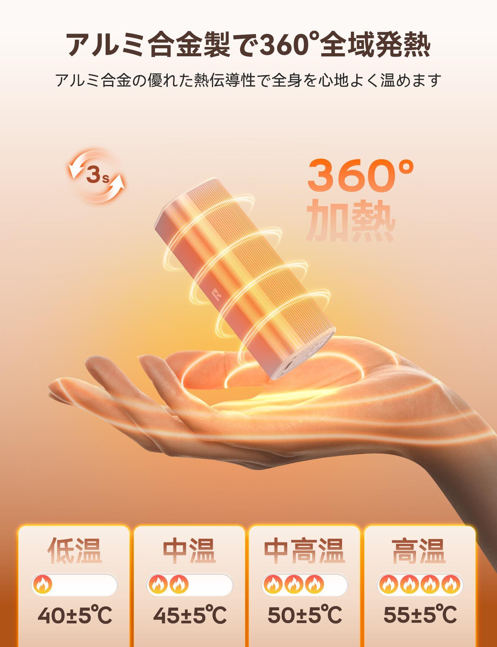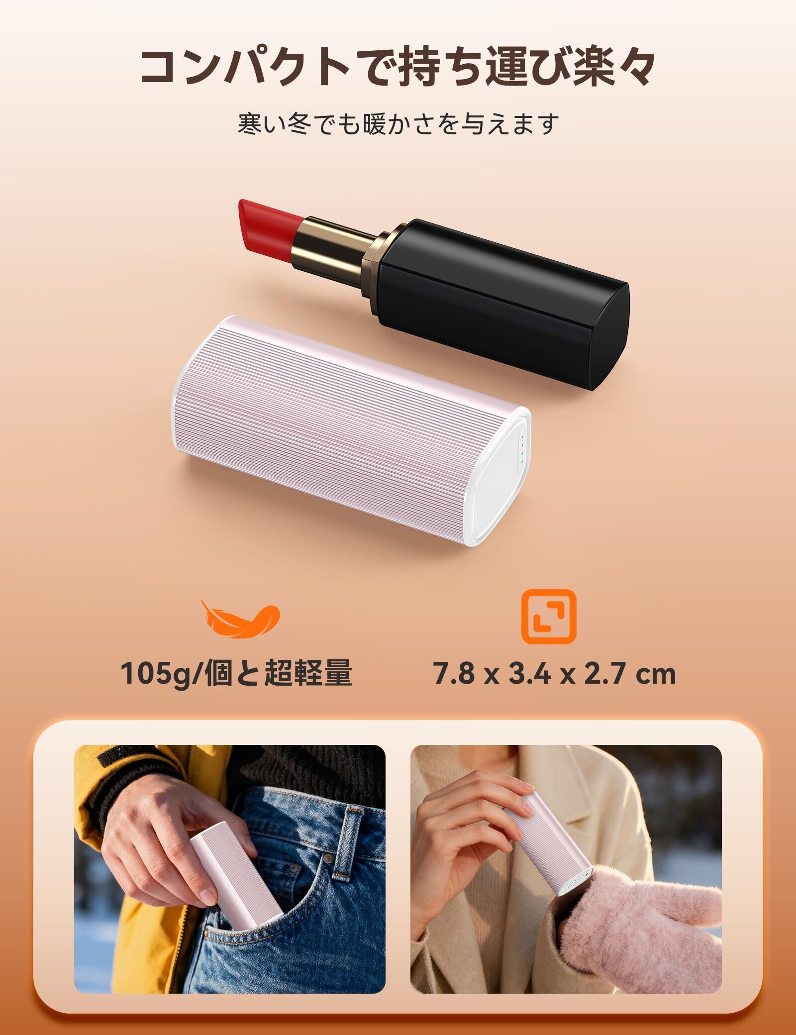 【超小型超軽量・収納兼充電一体型のスタンド付】スポーツの観戦や屋外イベント、アウトドアなどのシーンでは、持ち運びが便利なカイロがあると、冬の悩みを一挙に解決できますよ!RORRY社のこのカイロは、サイズが7.8×3.4×2.7cmのミニサイズで、1個あたりの重量は約105gと非常に軽量で、毎日の荷物に加えても全く負担になりません。スタイリッシュな円筒形デザインで,手のひら全体でしっかり握れて、冷えきった手指をポカポカに温めます!また、手のひらにおさまる小型モデルのため、手にフィットしやすく気軽に持ち運べ、小さい子どもから大人まで使用できます。さらに、充電と収納が一体型の充電スタンドが付属して,スタンドに置くだけで同時に2個のカイロを充電できる上、カイロの紛失や破損を防ぎます!ケーブルと接続した状態を維持することで、常に充電された状態で使えるようサポートしてくれます。さらに、本体にはTYPE-Cポートを装備して、USBケーブルで直接充電もOKです(※出力非対応のため、モバイルバッテリーとしては利用できません)。